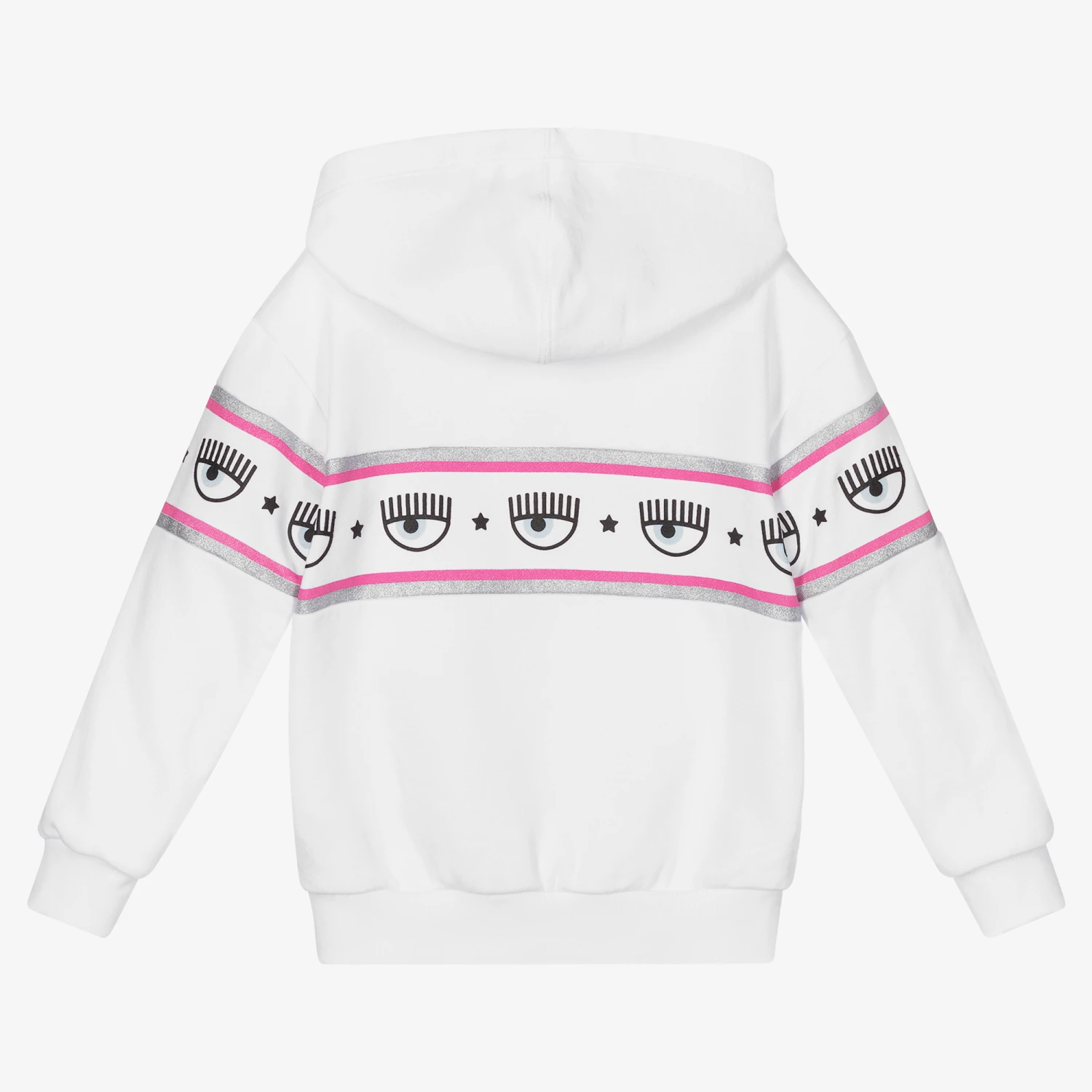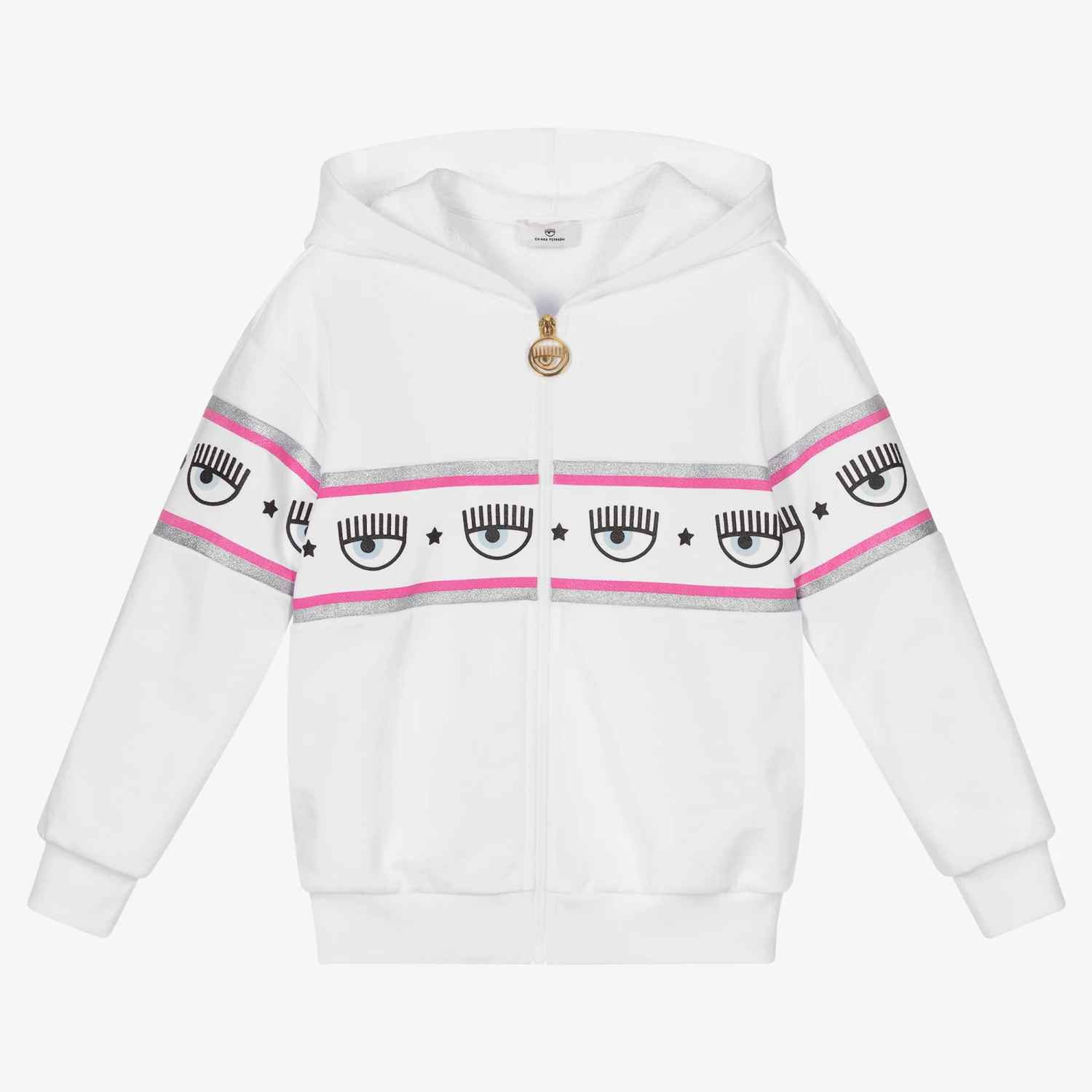 Hooded white zip-up top for girls by Italian brand Chiara Ferragni Kids. Made in lightweight sweatshirt cotton jersey, it has the brand’s Logomania logo on the front and back, with pink and glittery silver stripes. The zip fastening has a gold metal Eyelike logo pull tab.