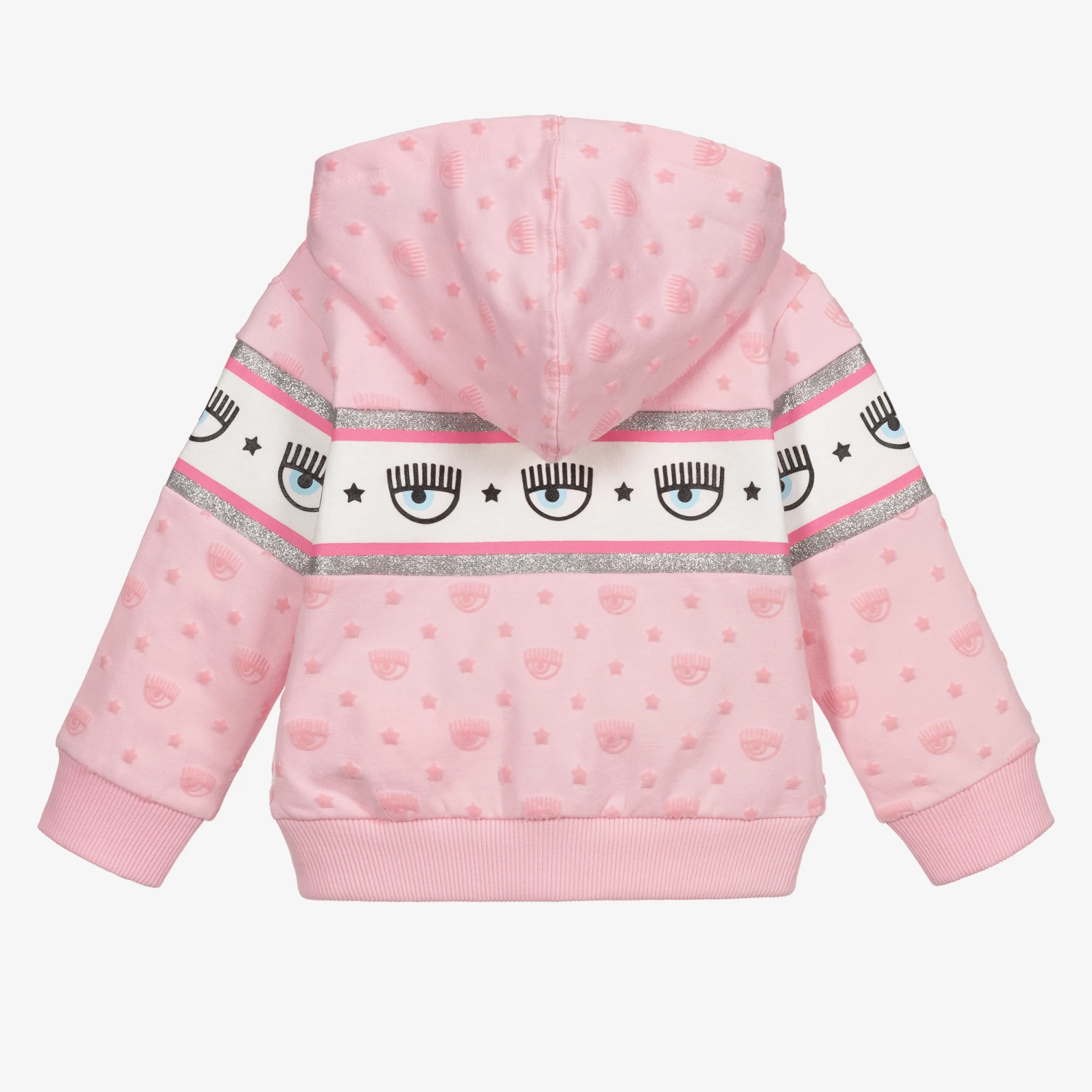 Pink zip-up hooded top for little girls, by Chiara Ferragni Kids. Made from soft cotton jersey, it has a cute Eyelike and star velour design all-over, with a white, pink and silver stripe across the chest featuring the cool Eyelike logo.