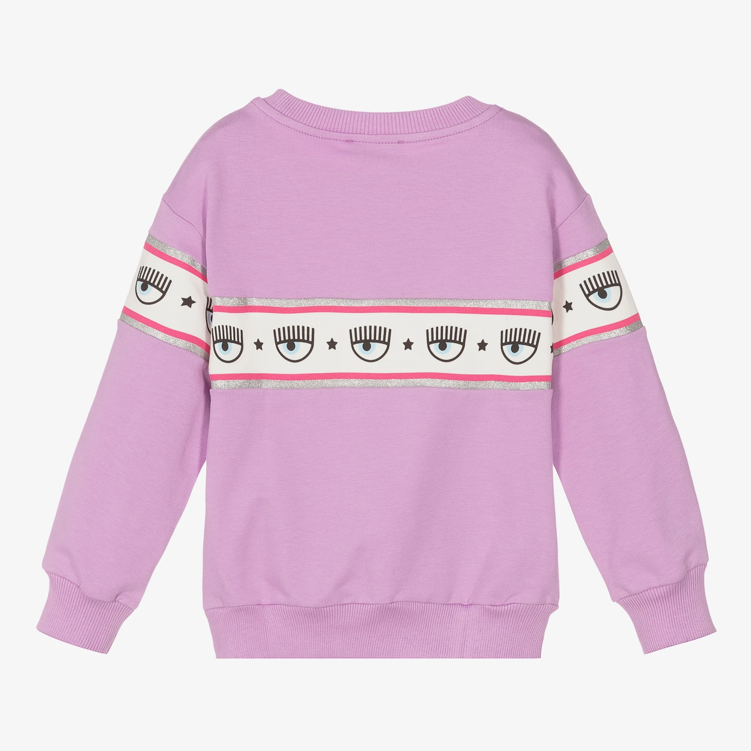 Girls lilac purple sweatshirt by Chiara Ferragni Kids, made in soft cotton jersey. It has the brand’s Maxi Logomania band across the chest and sleeves, featuring the signature Eyelike logo with pink and glittery silver stripes.