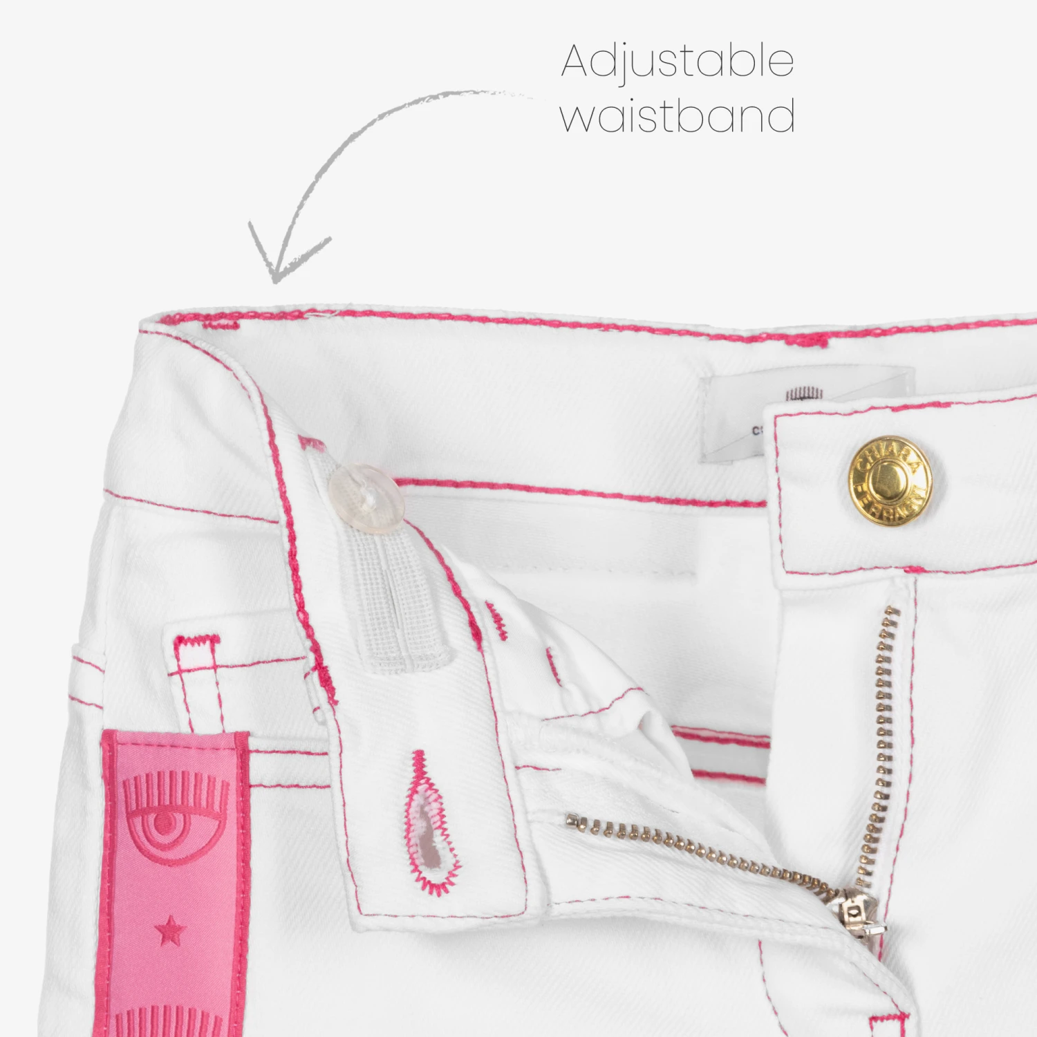 White jeans for girls by Italian brand Chiara Ferragni Kids. Made in soft denim, they have bright pink stitching detail and the brand’s pink Logomania logo tape along the sides of the legs. They fasten with a gold logo button and have a pink and blue Eyelike logo badge on the adjustable waistband.