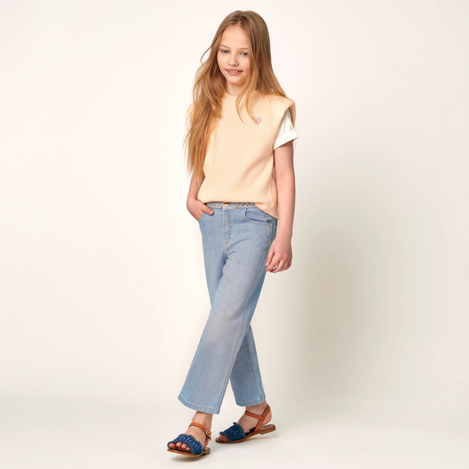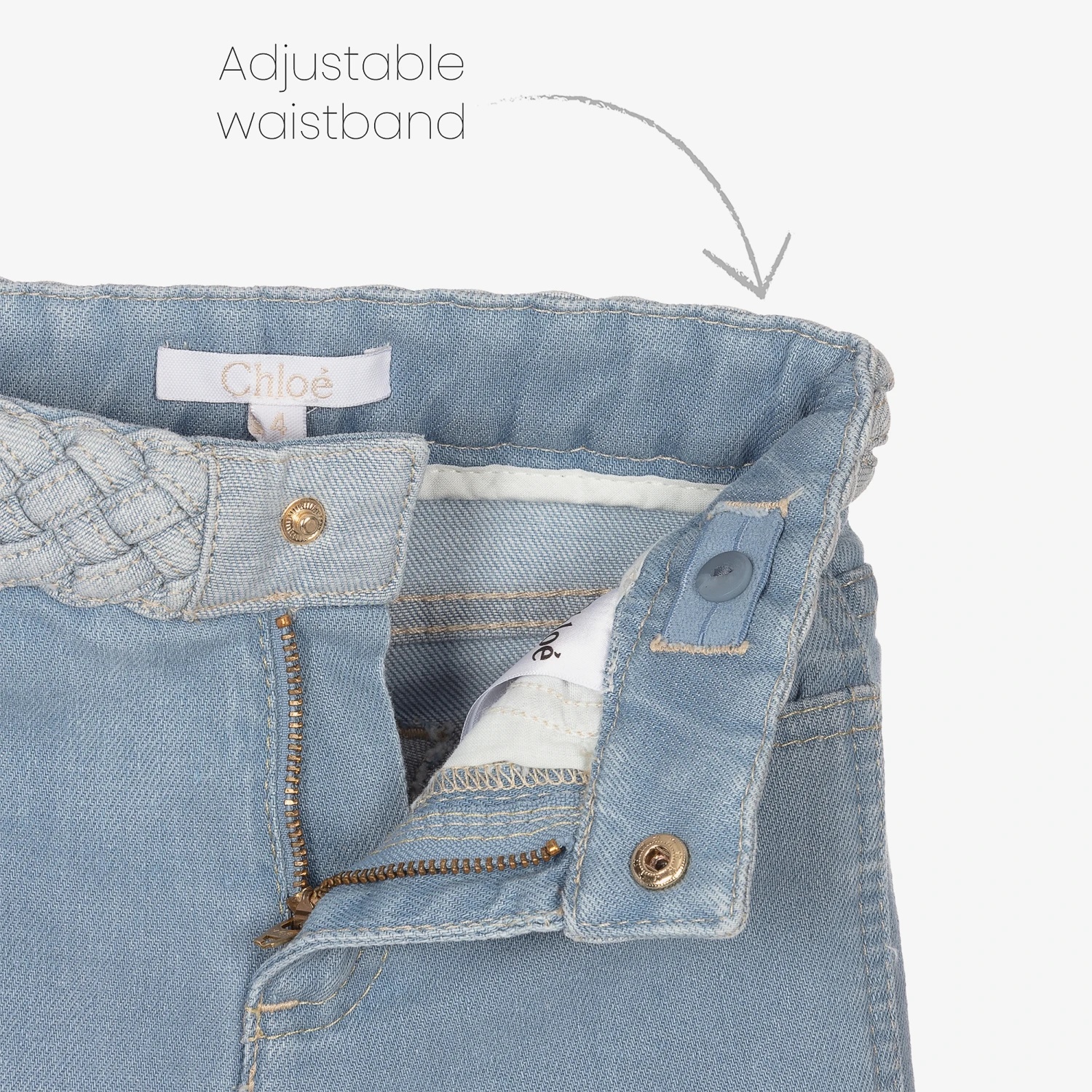 Girls light-blue jeans by luxury French designer, Chloé, with a high waist. Made in soft, stretchy cotton denim, they have signature braiding on the adjustable waistband, with a gold logo-embossed popper and a zip fastening. This classic five-pocket style has a brown logo patch on the back pocket.