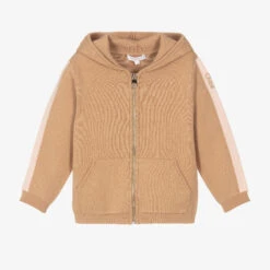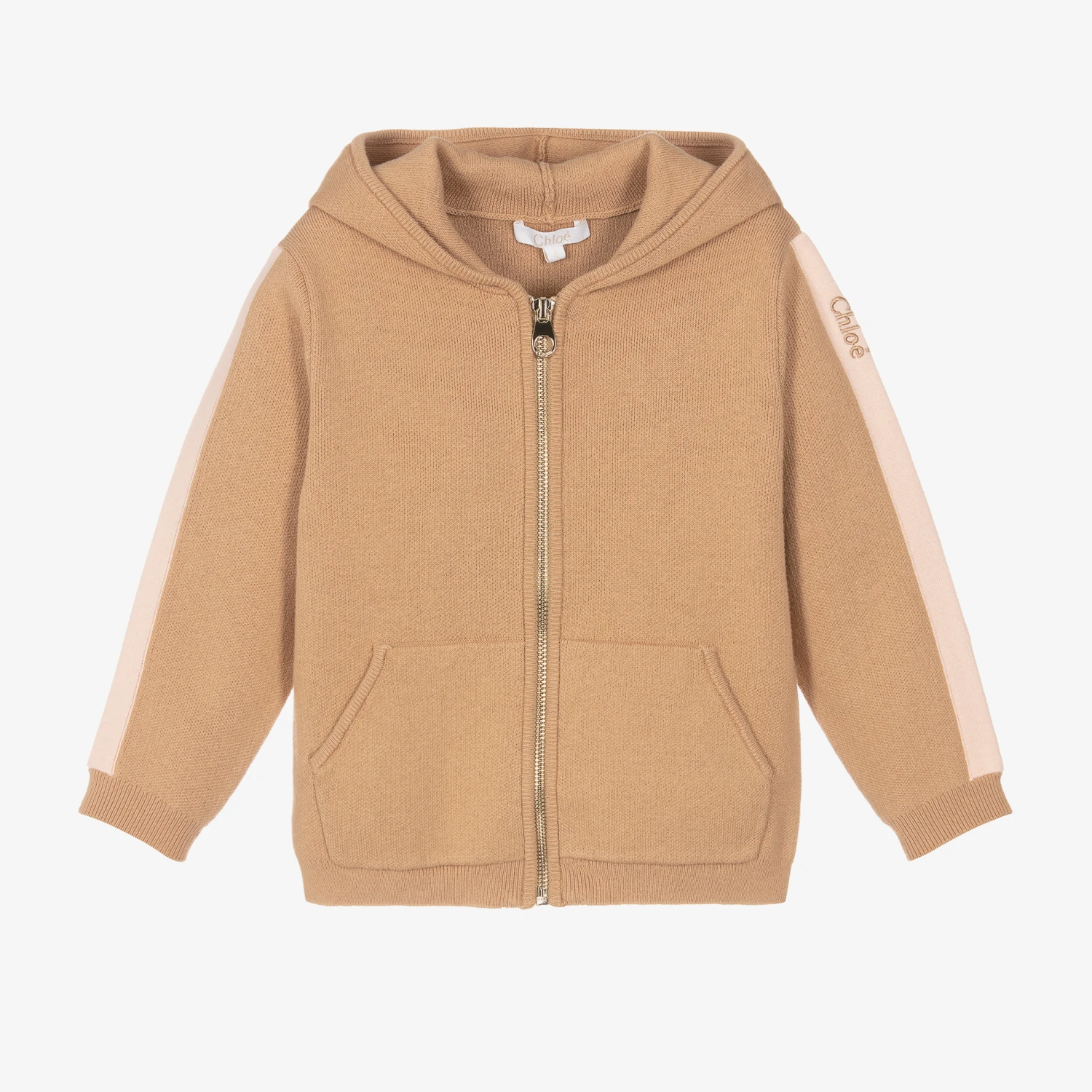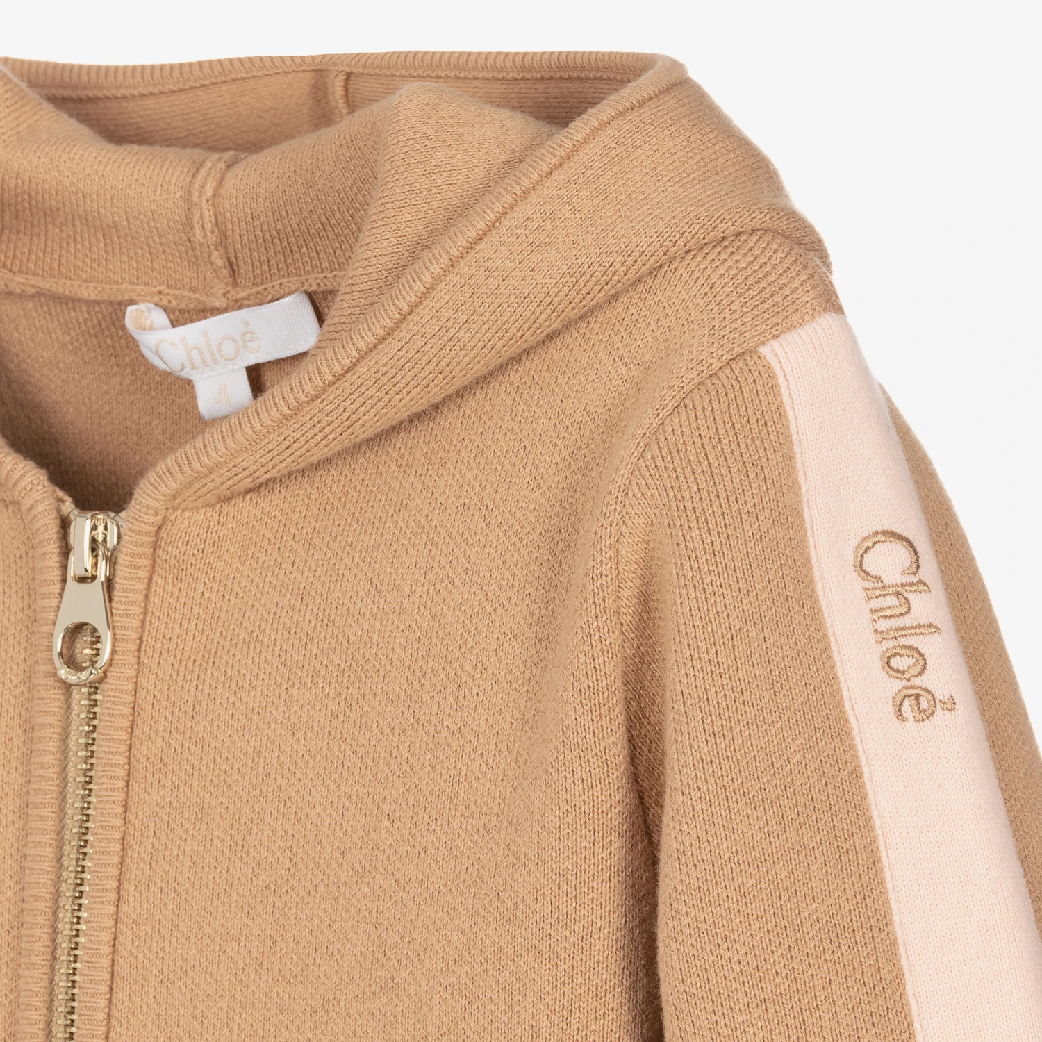 Beige casual zip-up hoodie for girls by luxury designer Chloé. Beautifully soft, this organic cotton and wool blend zip up hoodie has pale pink stripes on the sleeves, with beige logo embroidery.