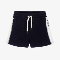 Navy blue organic cotton shorts for girls by luxury brand Chloé. The ivory side panels are trimmed with gorgeous guipure lace and detailed with a Chloé signature logo embroidered in navy blue. Ensuring a comfortable fit, the drawstring waist features shiny gold hardware, engraved with the French designer’s name. These comfortable shorts are made in soft and stretchy sweatshirt jersey, with useful side pockets.
