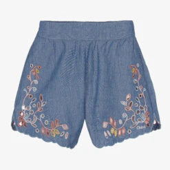 A beautiful pair of blue shorts for girls, by luxury French fashion house Chloé. Made from lightweight cotton chambray, these flowy shorts have an elasticated waistband on the back, with side seam pockets. They are embroidered in colourful floral cutwork, with dreamy scalloped edges and a pale pink signature Chloé logo on the hem.