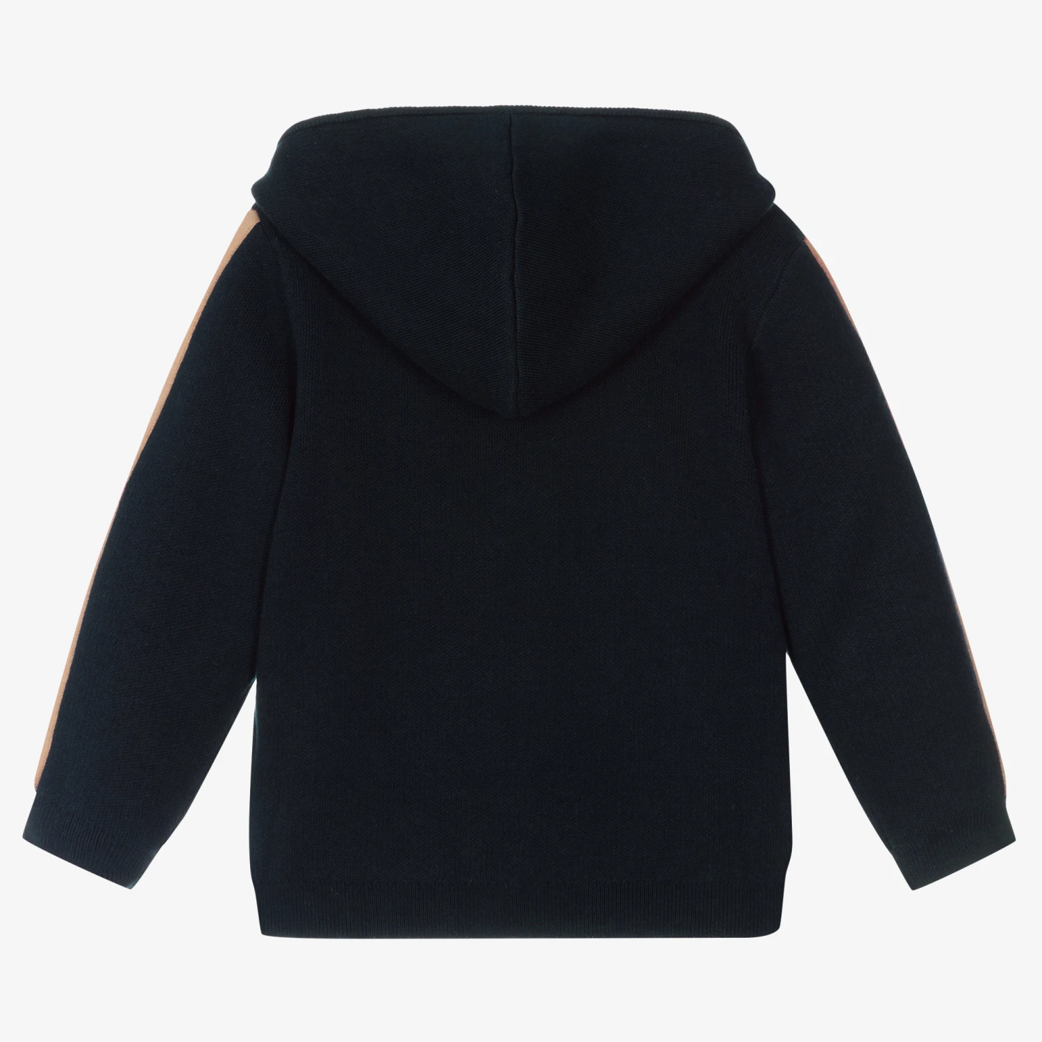 Navy blue casual zip-up hoodie for girls by luxury designer Chloé. Beautifully soft, this organic cotton and wool blend zip up hoodie has beige stripes on the sleeves, with navy blue logo embroidery.