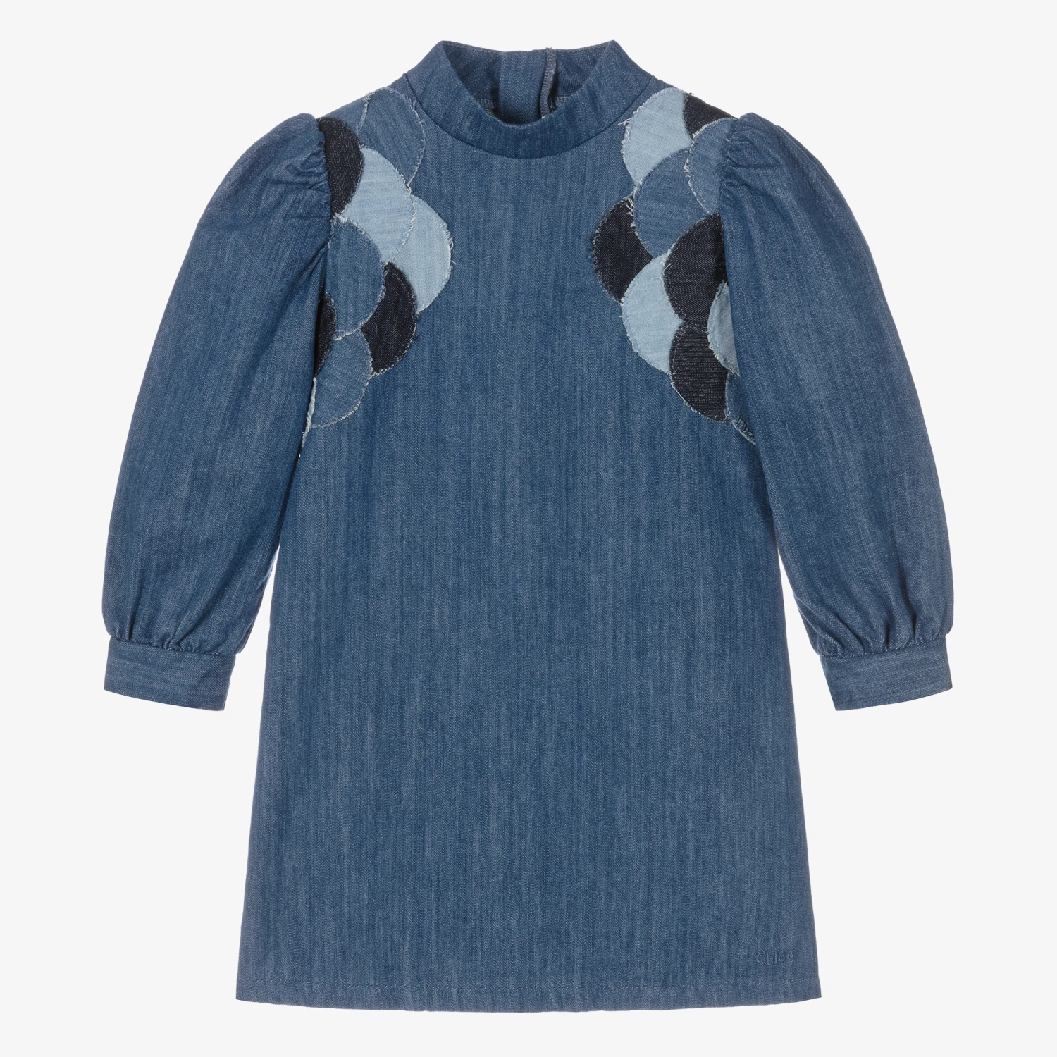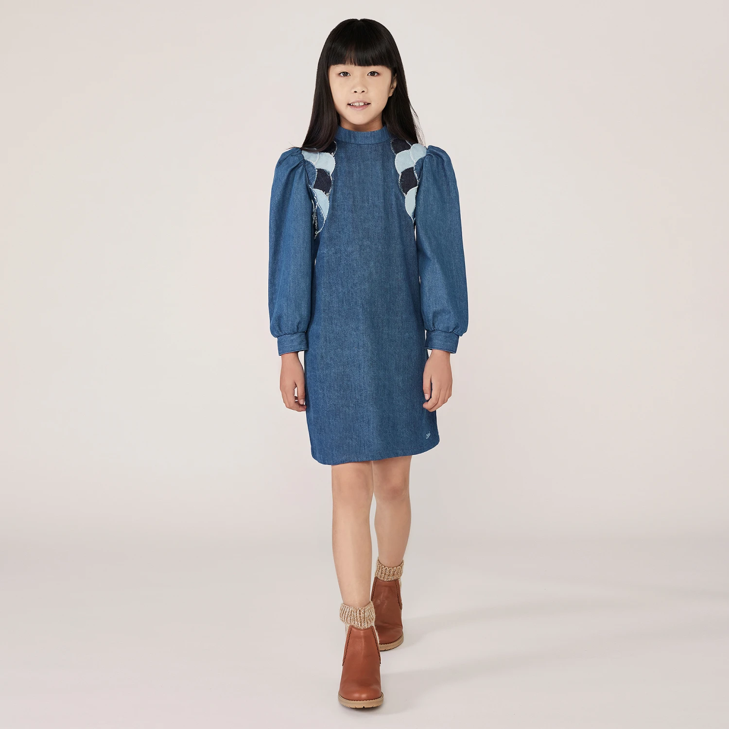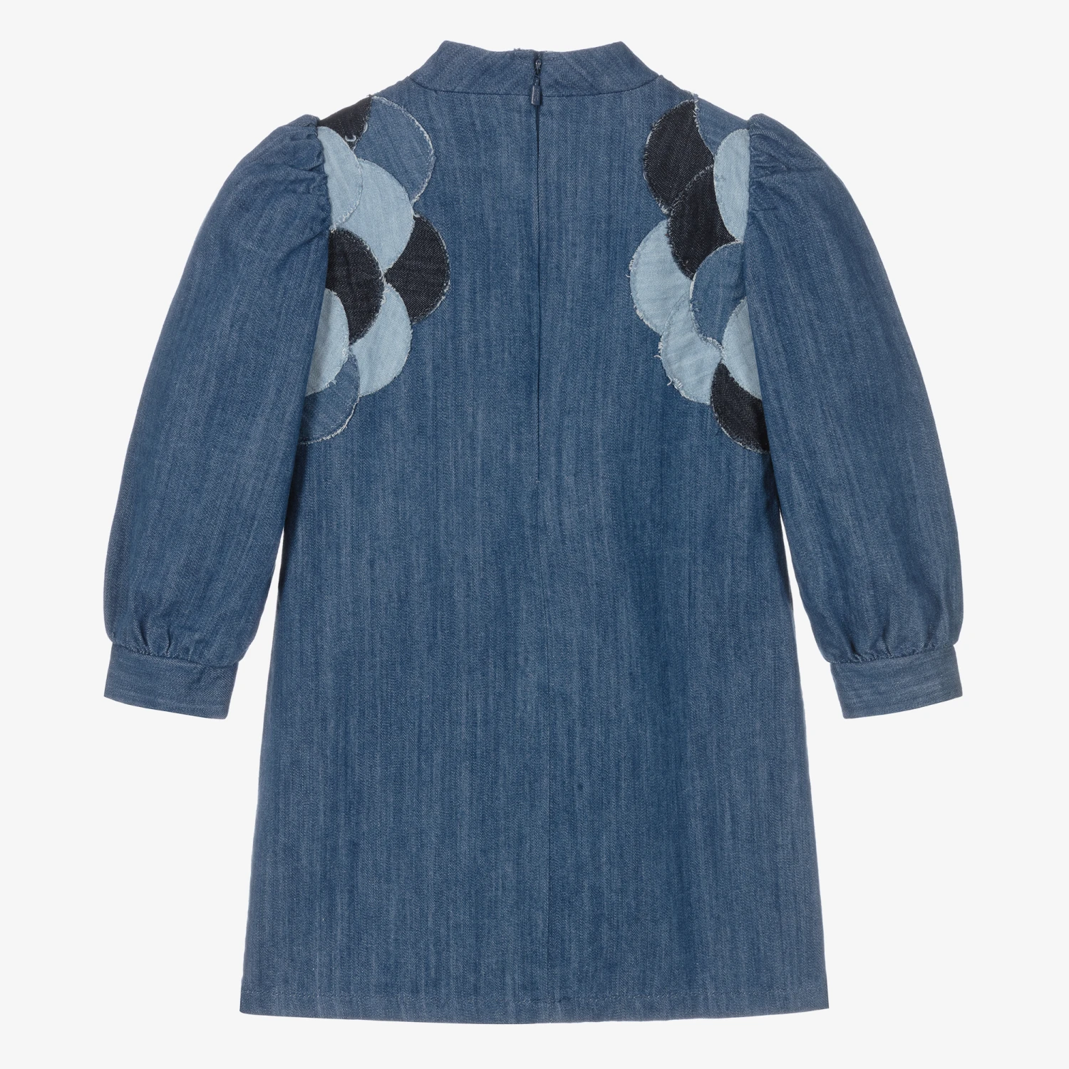 Blue denim dress for girls by luxury French designer Chloé. Soft and comfortable, it is trimmed with layered, scalloped denim appliqués in shades of blue. There are chic balloon sleeves and a high neck, for a 60’s inspired look. This stylish dress is discreetly signed with the brand’s signature embroidered on the hem and it fastens with a concealed back zip fastening.
