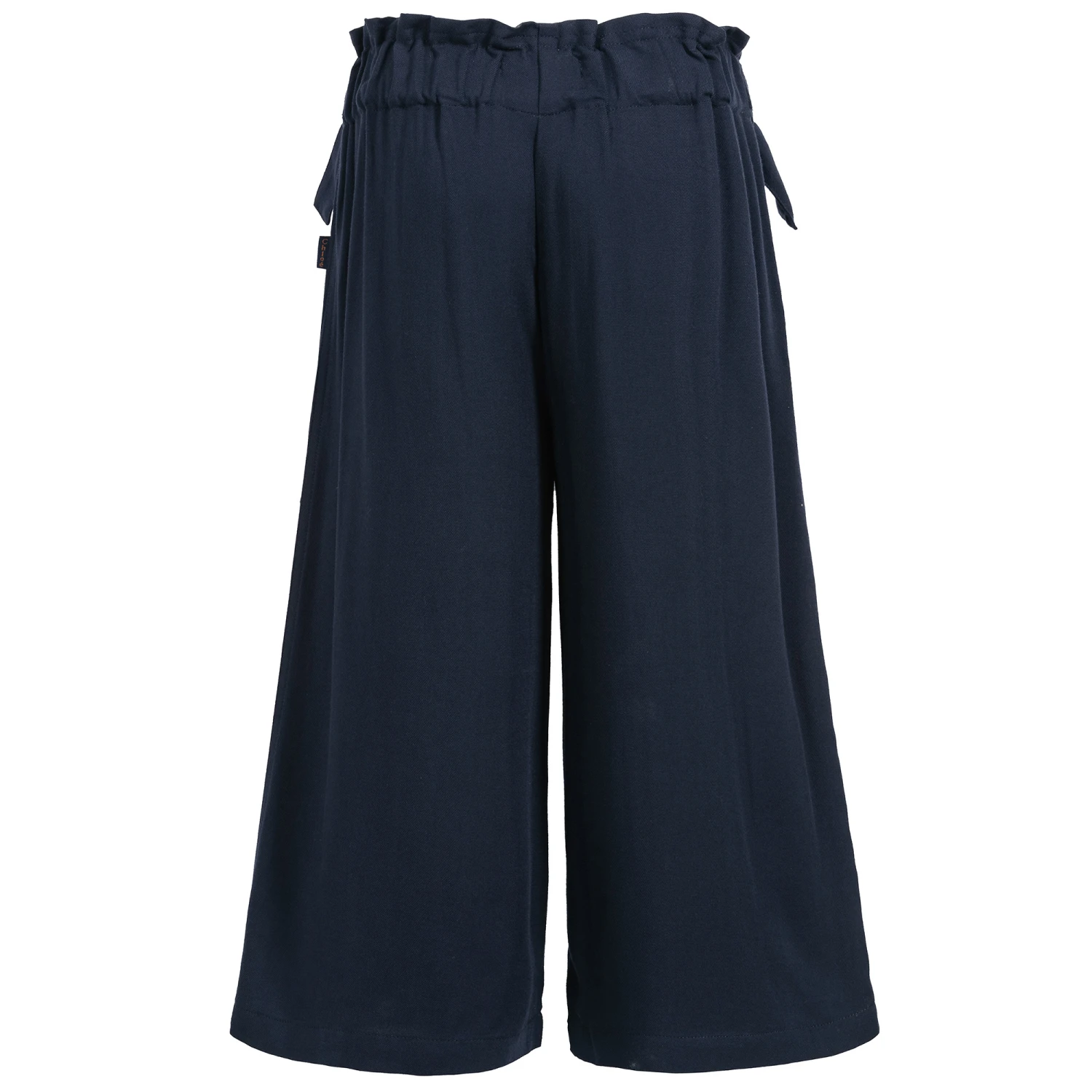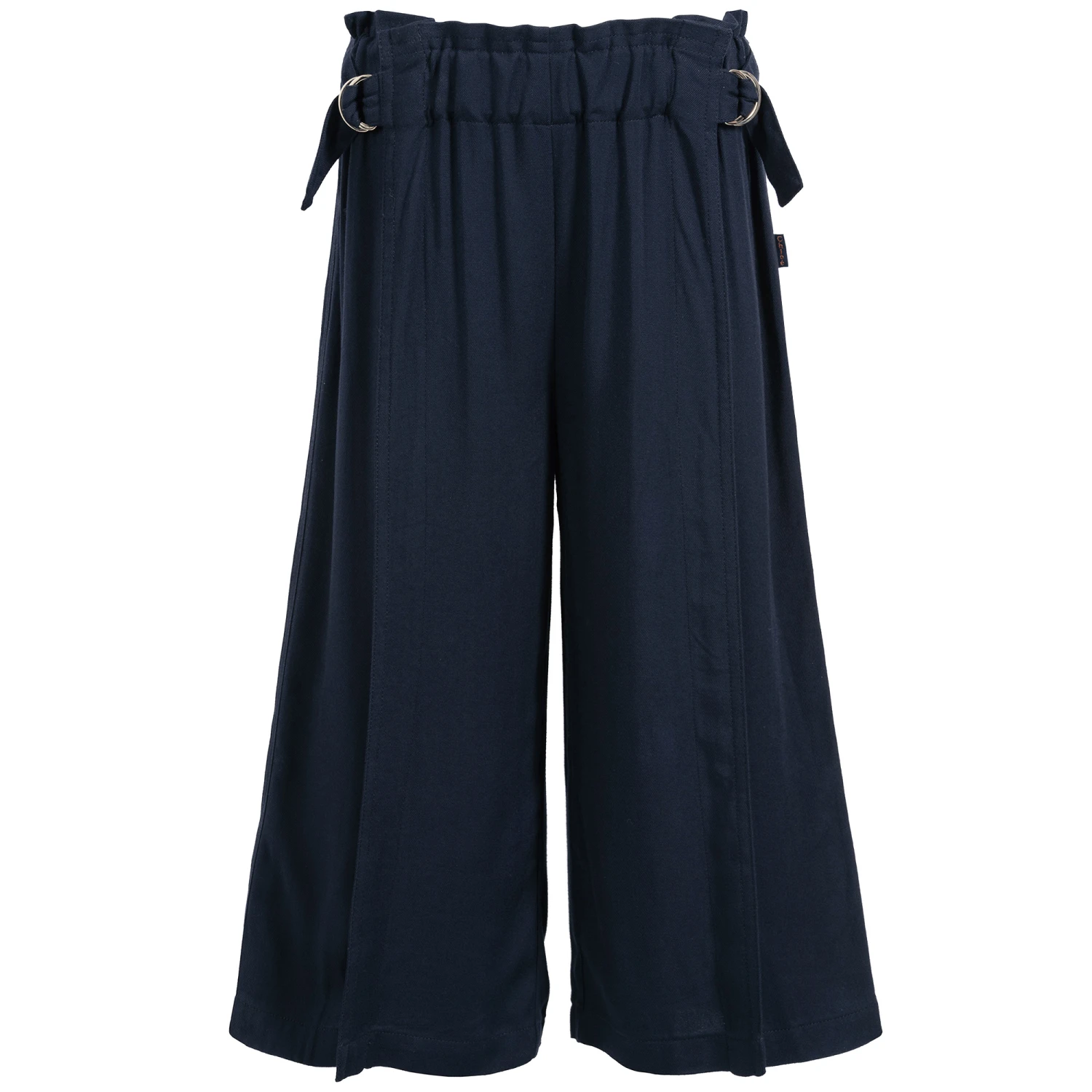 Smart and floaty, Mini-me navy blue culottes by Chloé. Made in lightweight, super soft viscose, they have a gathered, elasticated waistband with side ties secured with gold metal D-rings. There is a pretty pleat down the centre of each leg.