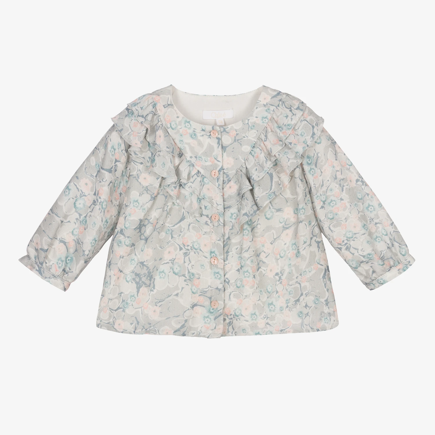 In shades of grey, blue and pink, this lovely floral blouse for little girls is by luxury French brand Chloé. It is made in a soft viscose and wool blend, with pretty ruffles on the back and front. There are logo engraved button fastenings down the front, with signature Chloé embroidery at the hem.