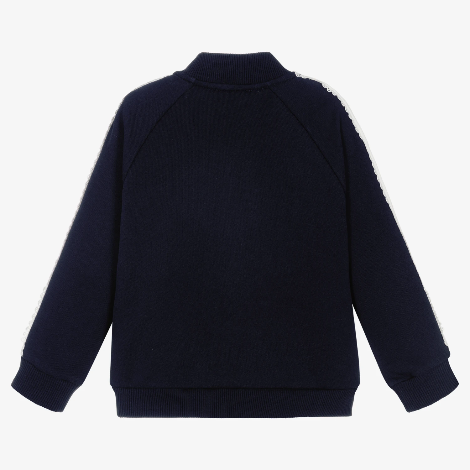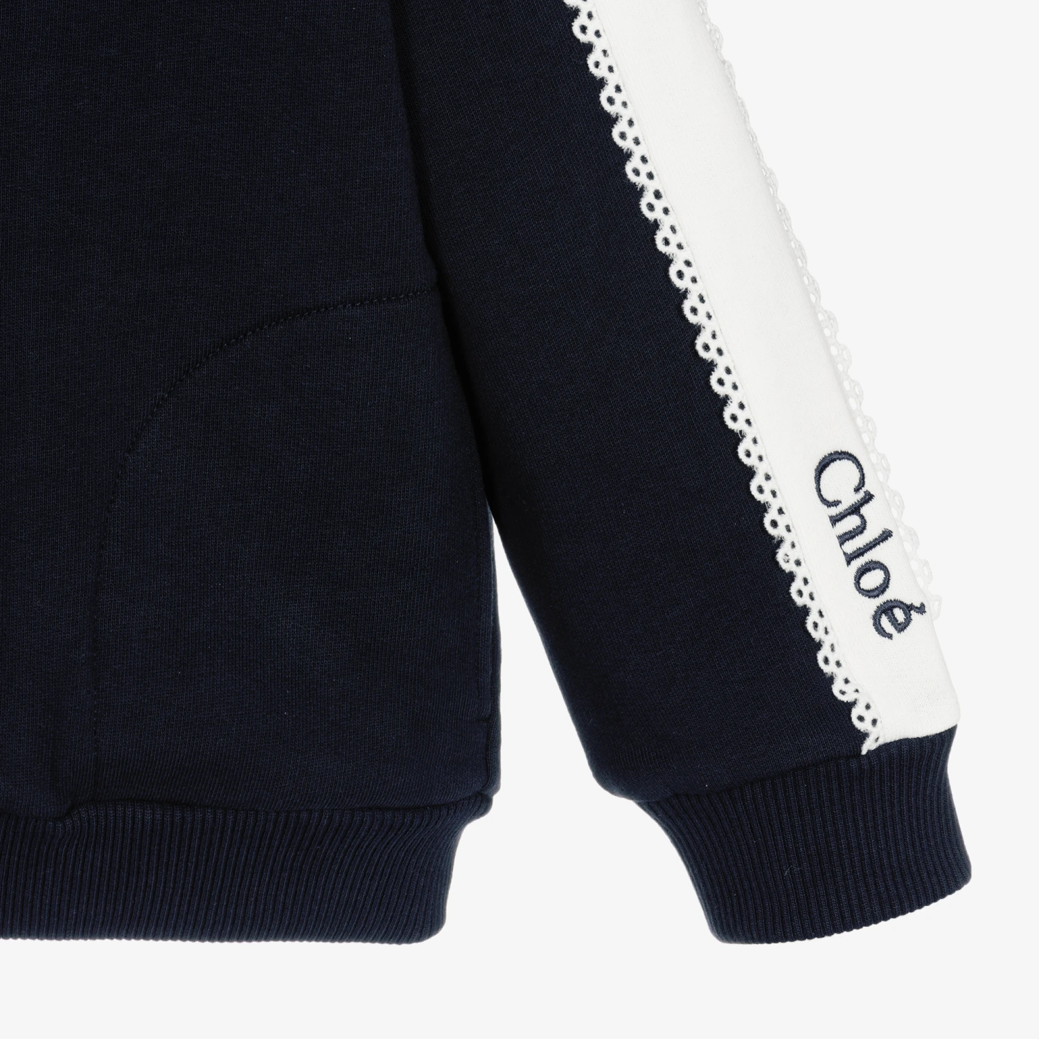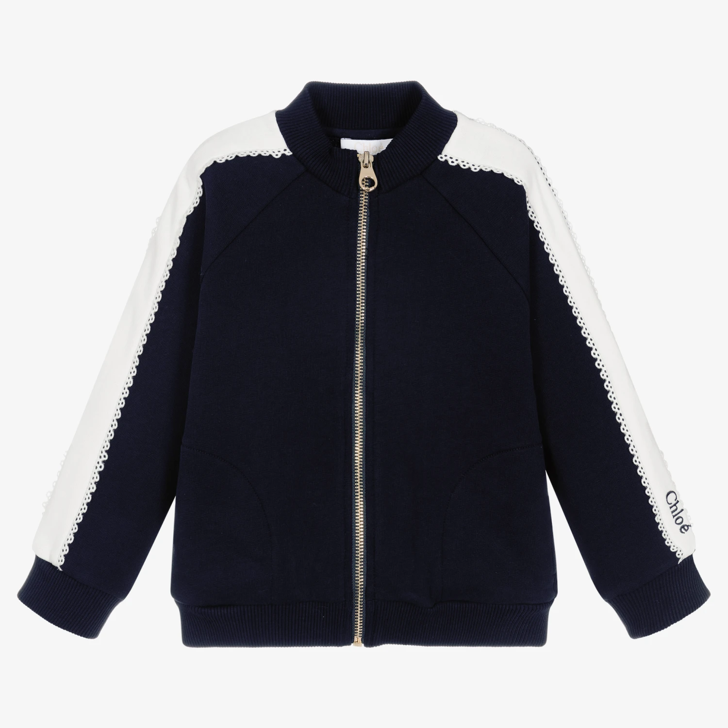 Pretty navy blue organic cotton zip-up top for girls by luxury French brand Chloé, with sporty ivory bands on the sleeves edged in guipure lace. There is an embroidered navy blue logo on one sleeve and a branded gold tone zip-pull for subtle brand recognition. The top has neat, ribbed trims and useful side pockets.