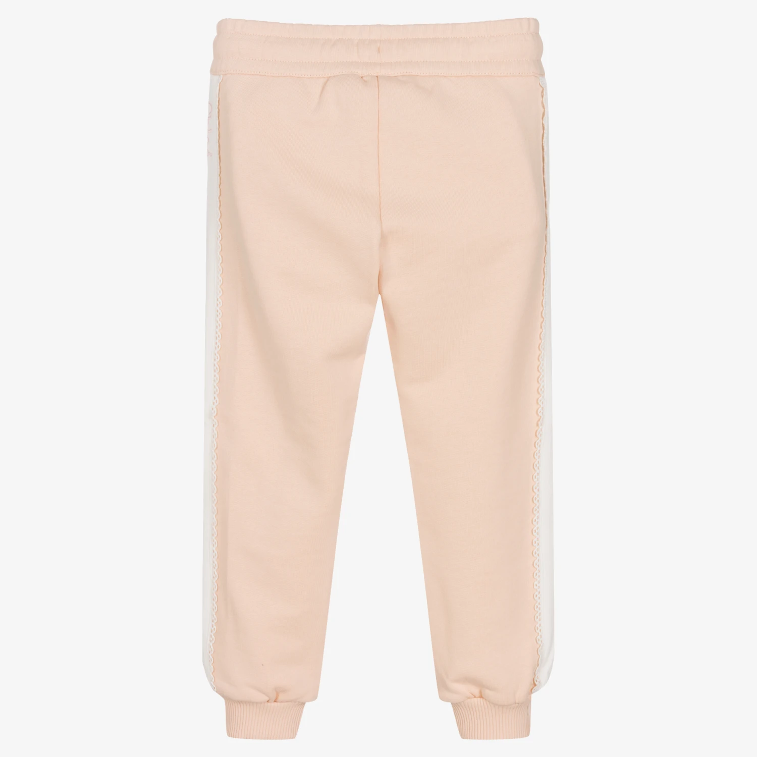 Pale pink organic cotton joggers for girls by luxury French designer Chloé, ideal for relaxed days. Unmistakably by the brand, they have the signature logo embroidered on one side in navy blue. Made in comfortable jersey, they have jetted front pockets and white side panels with embroidered guipure lace trims. The elasticated waistband has a drawstring for a good fit, with shiny gold logo eyelets and end caps.