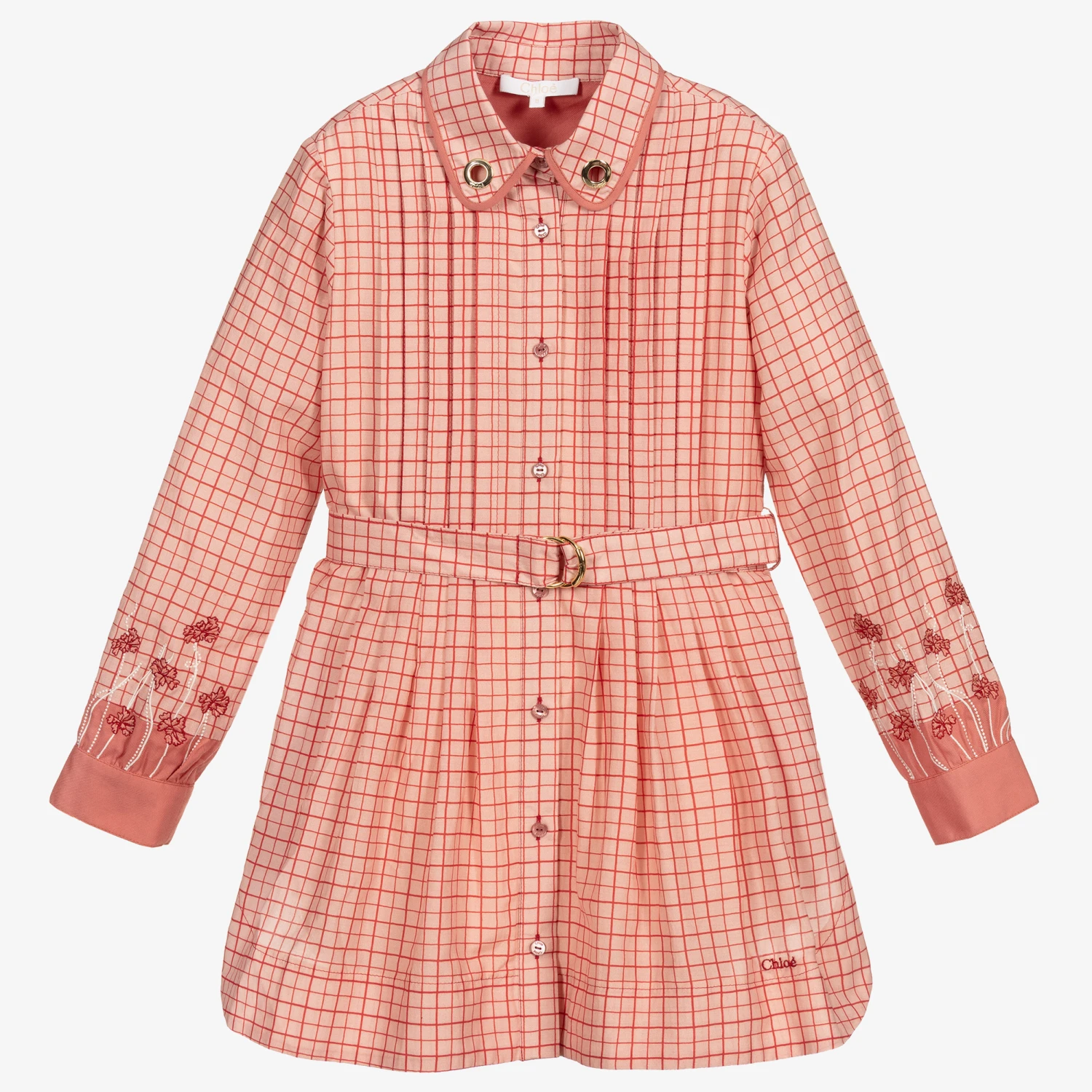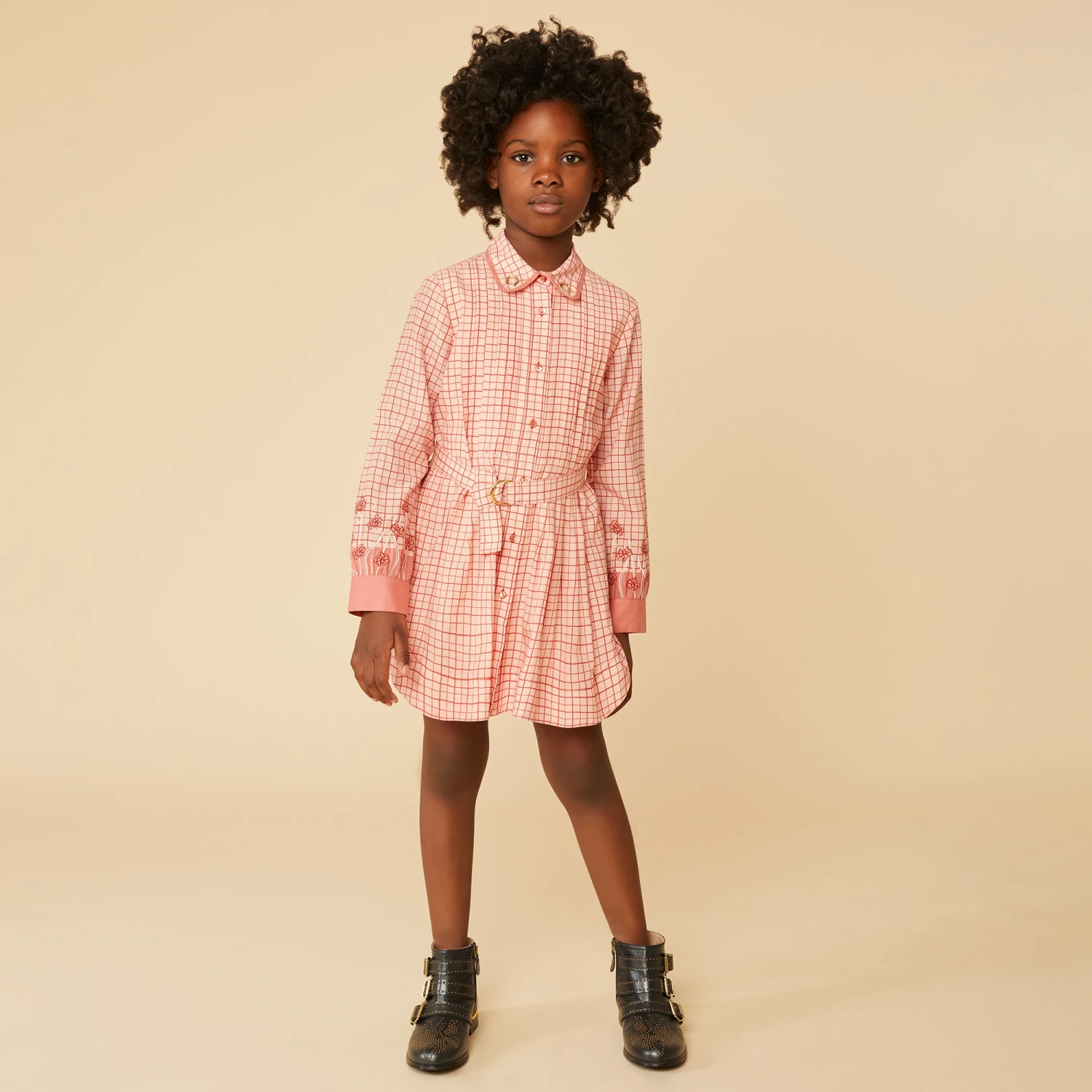 Casually elegant pink check shirt dress from luxury French brand, Chloé. Made in soft cotton twill, the dress has engraved eyelets on the collar and pintucks on the bodice. Beautiful embroidered flowers adorn the sleeve cuffs and the curved hem has an embroidered logo. The detachable fabric belt has an engraved gold D-ring buckle and there are concealed side pockets.