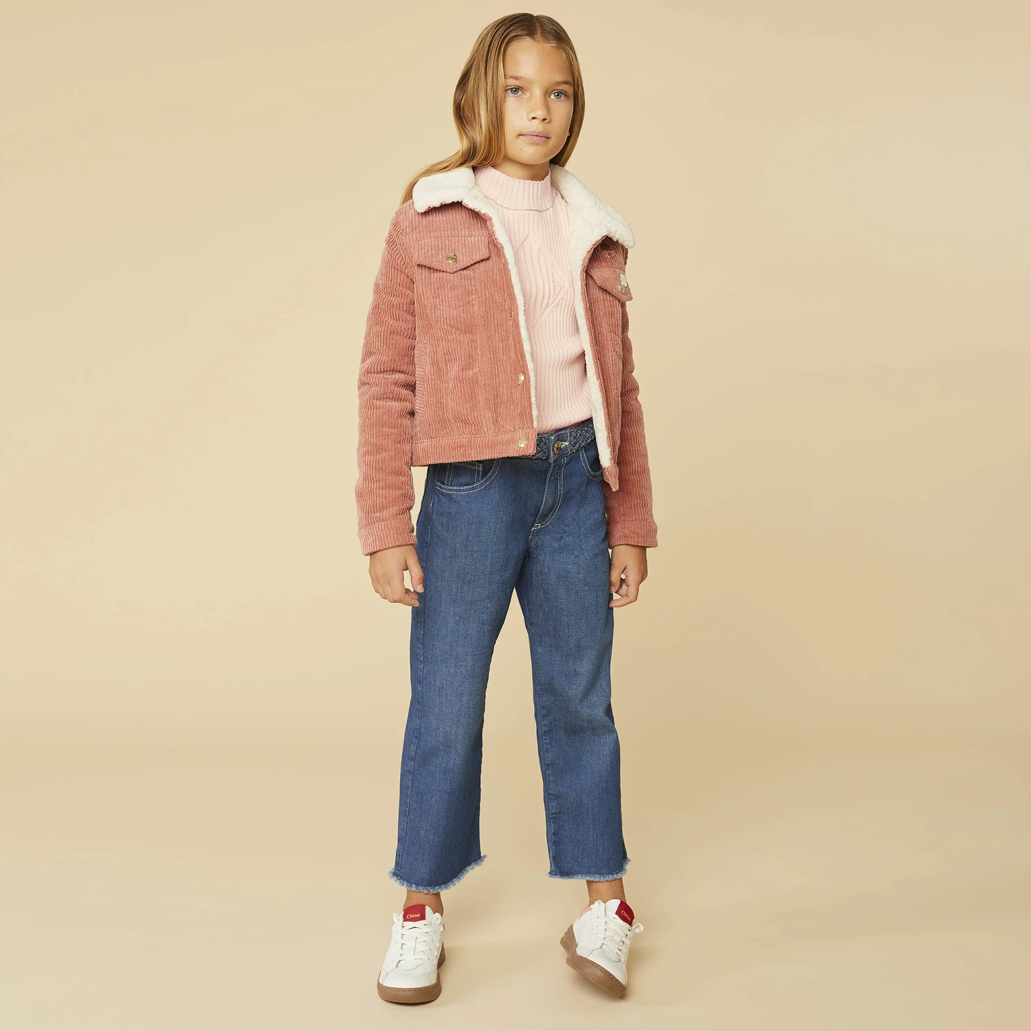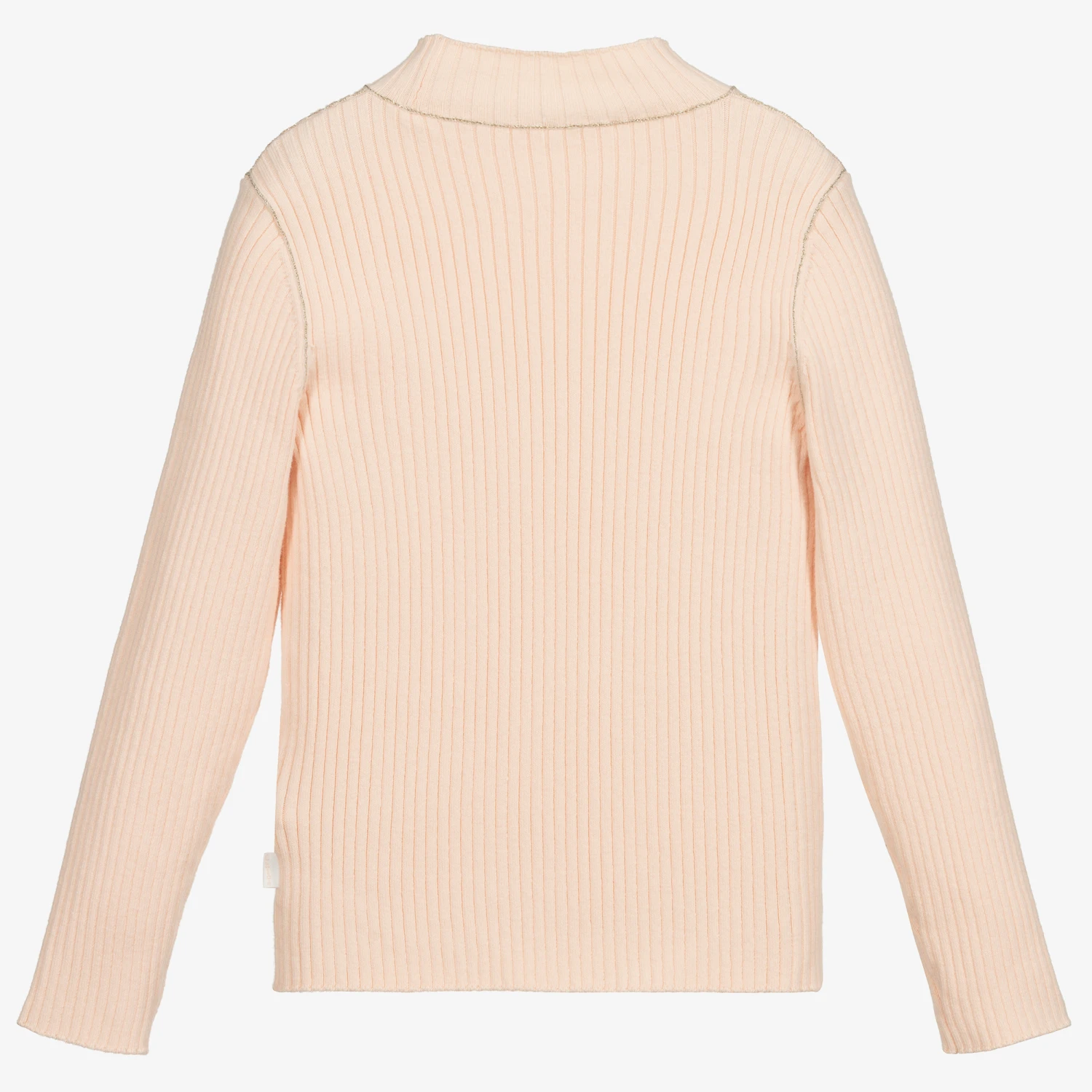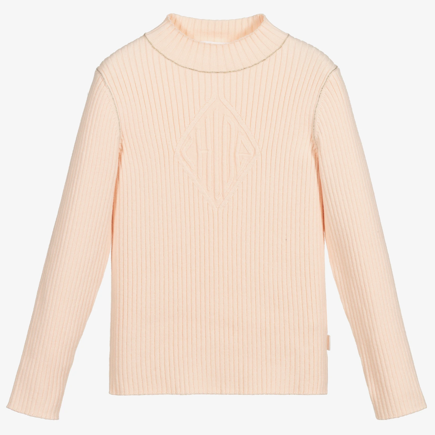 Pink ribbed jumper for girls by luxury French brand Chloé, inspired by the adult collection. Made in a soft cotton knit with a touch of wool for extra warmth, it is patterned with the designer’s logo on the front and has sparkly gold lurex trim.