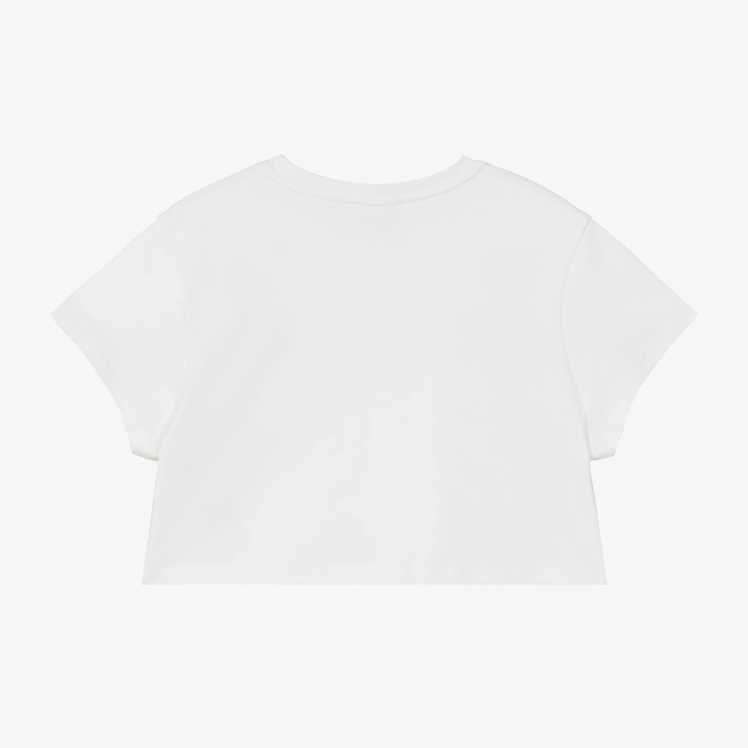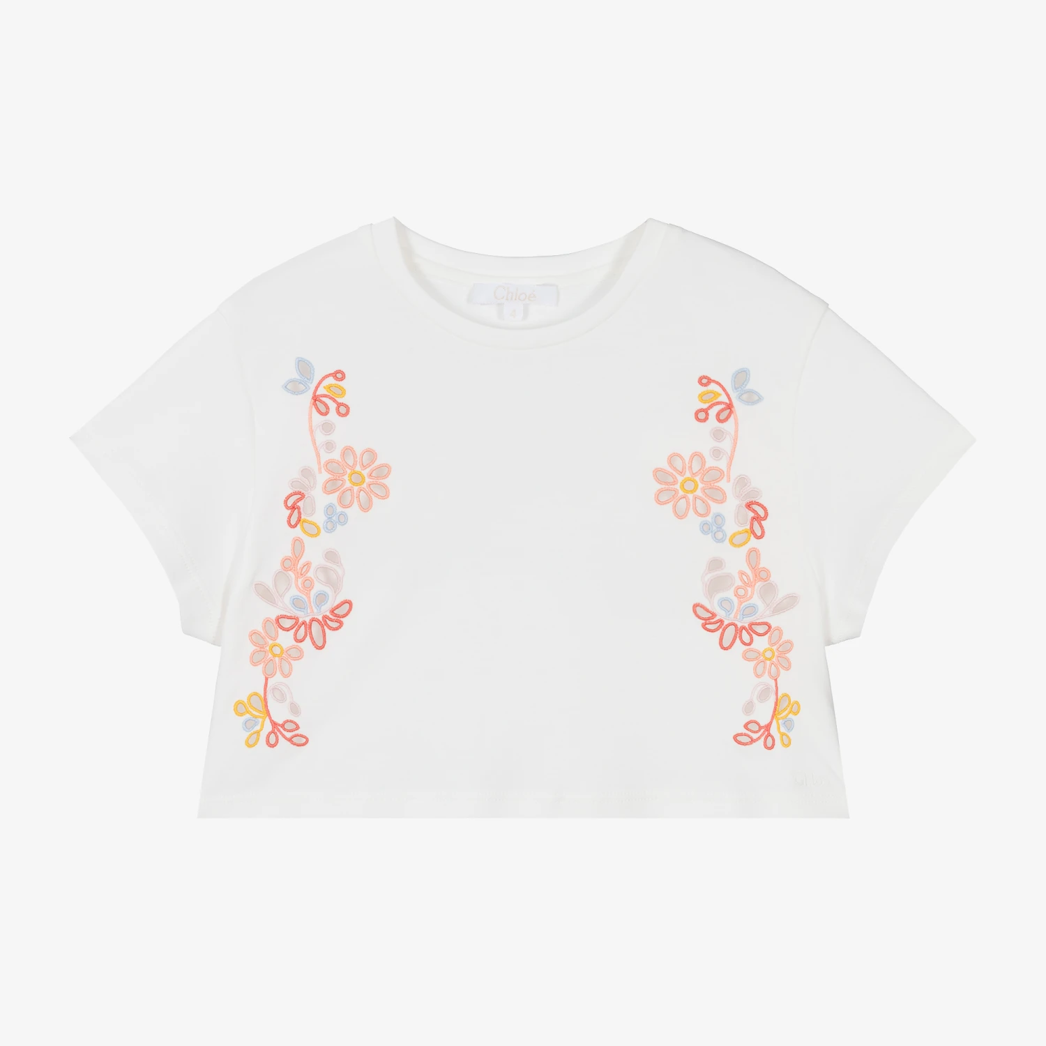 White T-shirt for girls by luxury French designer Chloé, made in stretchy, organic cotton jersey. Great for casual wear, this short-sleeved T-shirt has beautifully embroidered floral cut work on the front in shades of orange, pink, yellow and blue. The brand’s logo can be seen above the hem in tonal embroidery.