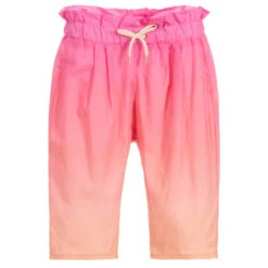 Pale pink trousers for younger girls by Chloé, that fade to orange. Made in lightweight cotton and fully lined, they have an elasticated waistband with a peachy pink bow on the front. The designer’s logo is embroidered in pink on the back.