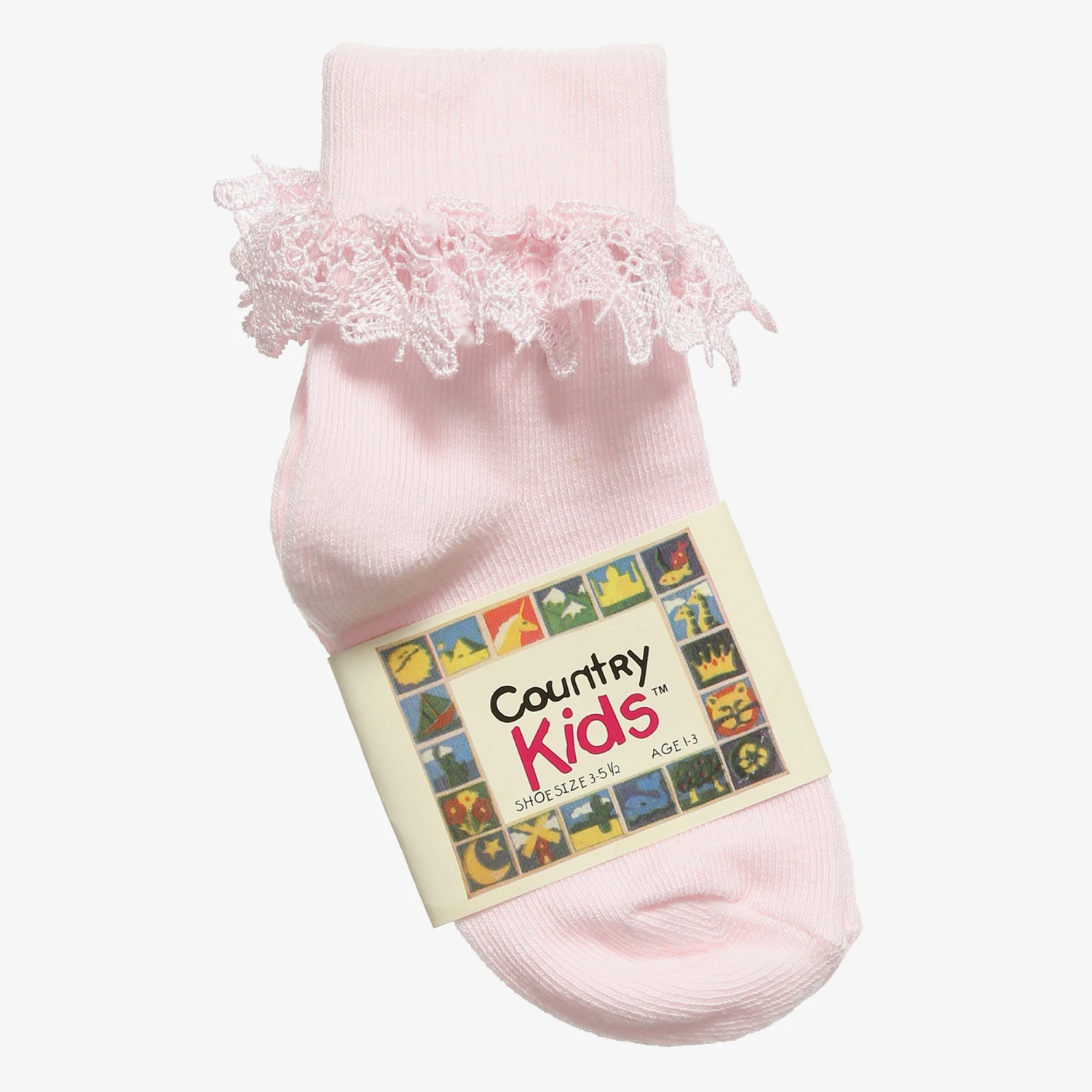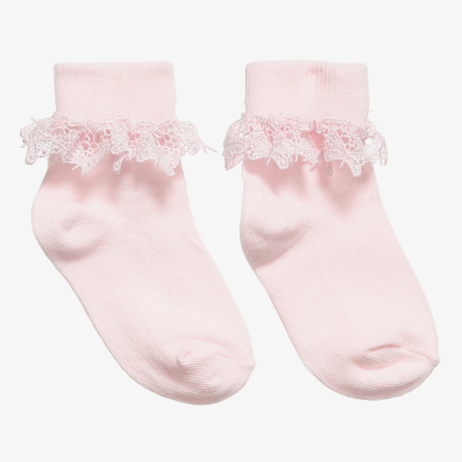 Pink socks for girls by Country Kids, made in a soft cotton blend. They have a frilly lace detail around the ankles with a pretty butterfly design.