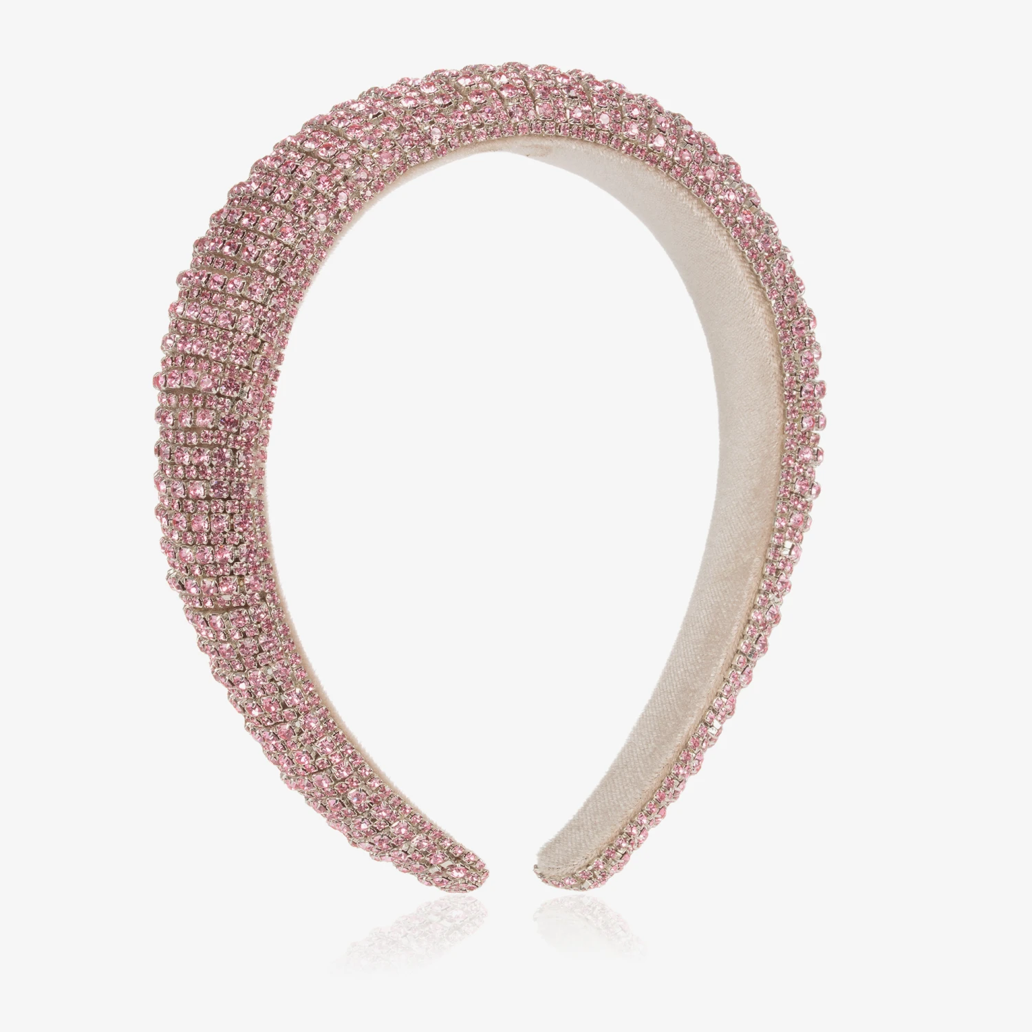 Pink velvet hairband for girls by British designer David Charles. Designed for special occasions, this luxury hair accessory is decorated with elegant pink diamanté embellishments, set in silver metal. Ideal to complete an outfit, the flexible band is padded for comfort.