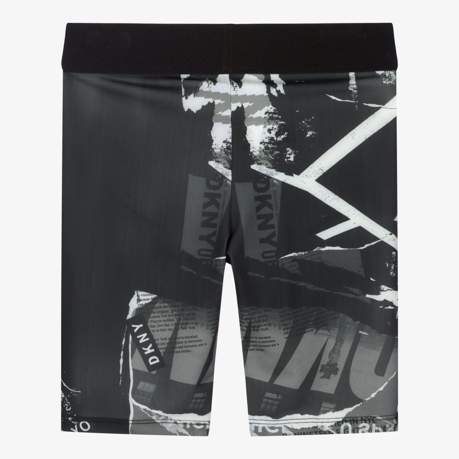 Girls black and grey collage print cycling shorts by DKNY. Silky and stretchy, they have an all-over print and a wide, logo-branded stretchy waistband.