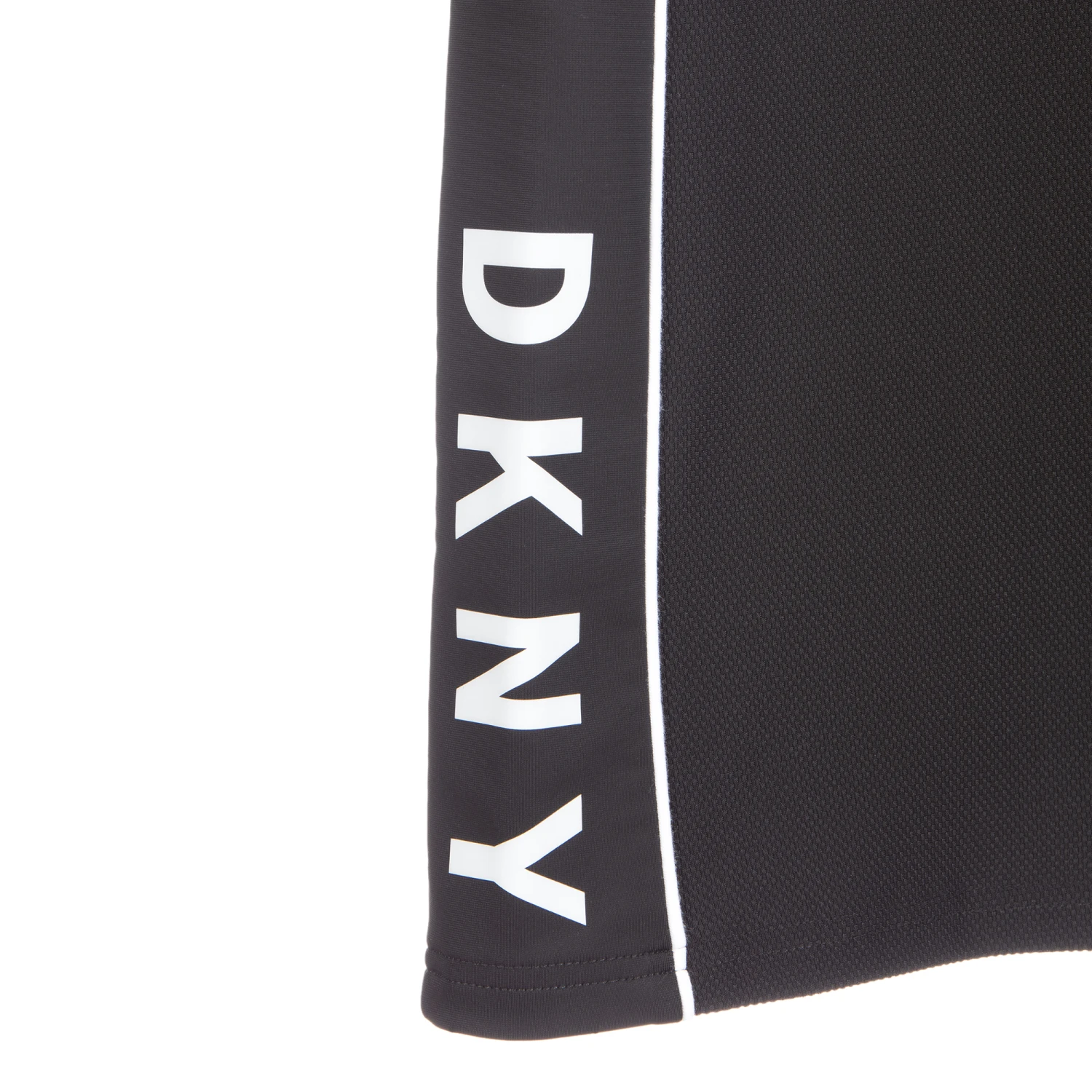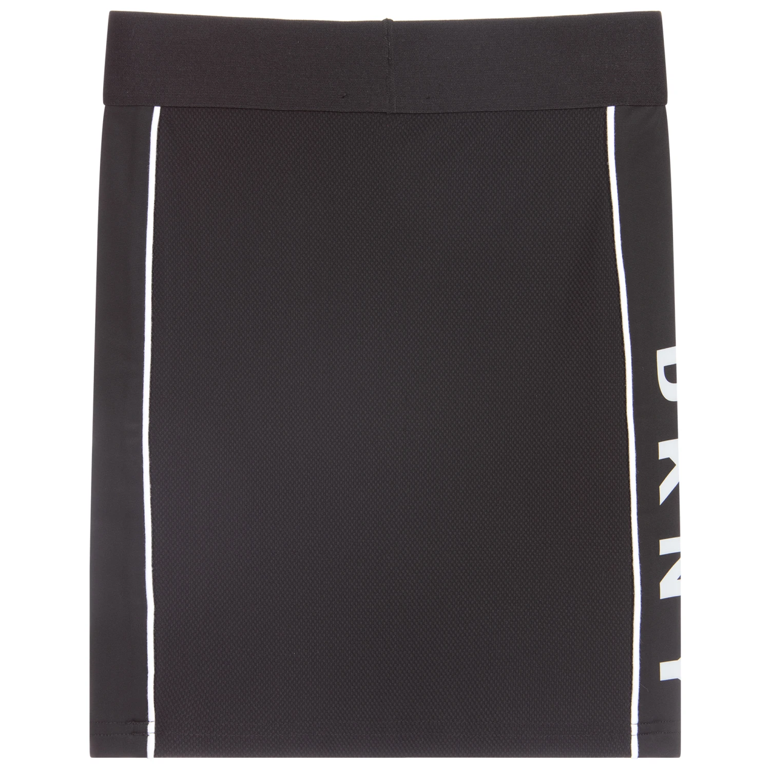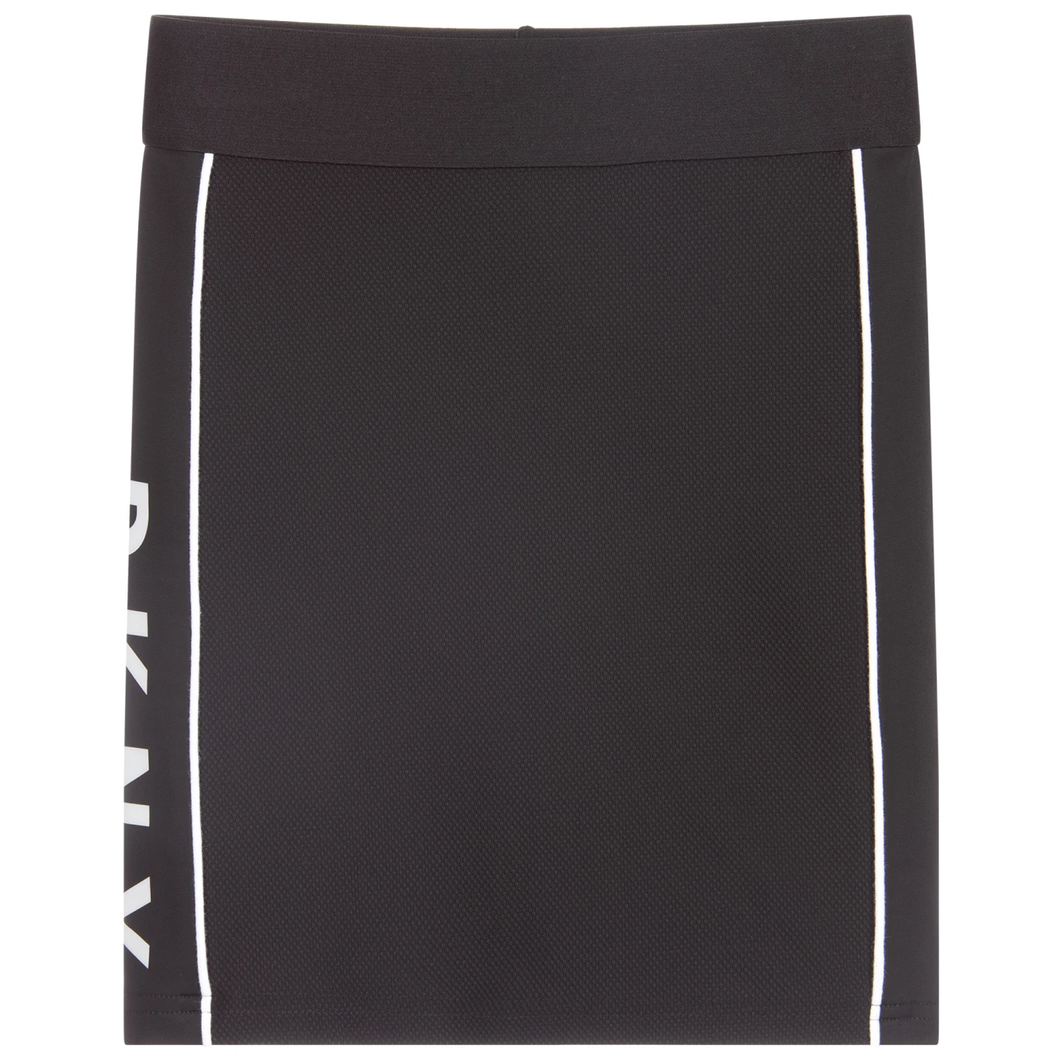 Girls black sporty skirt by DKNY, with white piping trims and a wide elasticated waistband. Made in waffle textured sports jersey, it has smooth panels on both sides, with a white logo print on one side.
