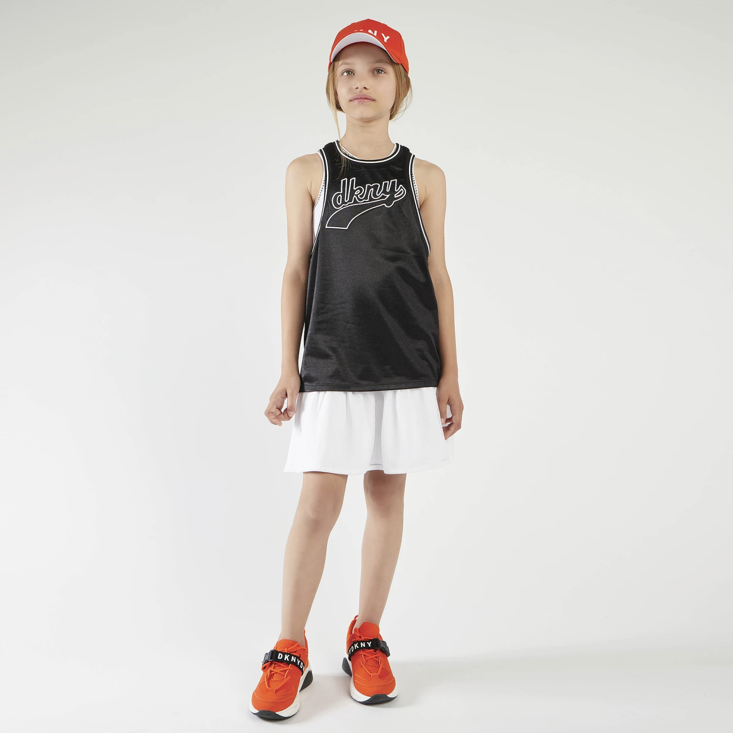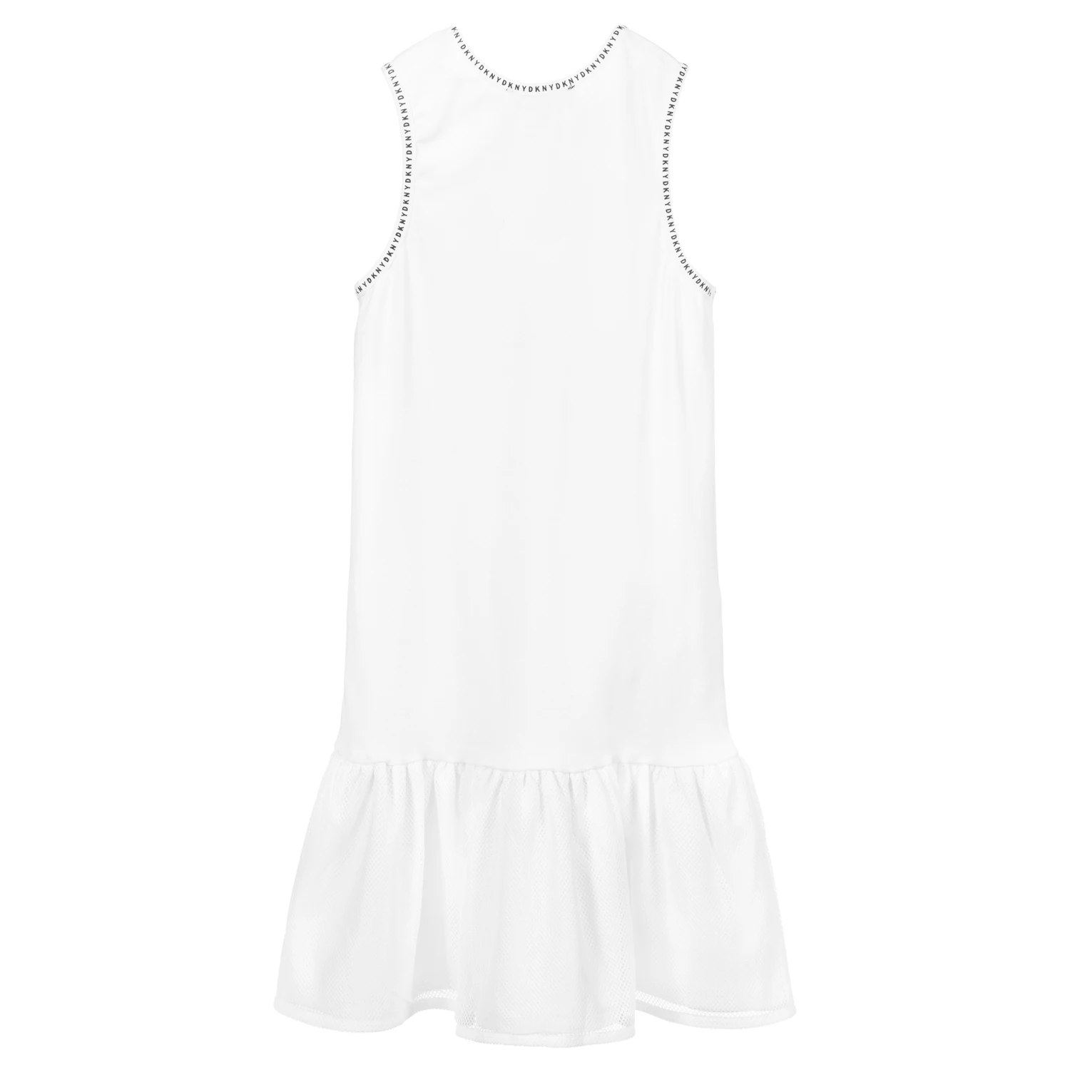 A white cotton jersey dress by DKNY with a black shiny jersey vest top that may be worn over the top or separately. The black top has wide armholes and a racerback, with stretchy black and white trim, and a large logo patch on the front. The white dress has black logo print and a mesh ruffle on the hem.