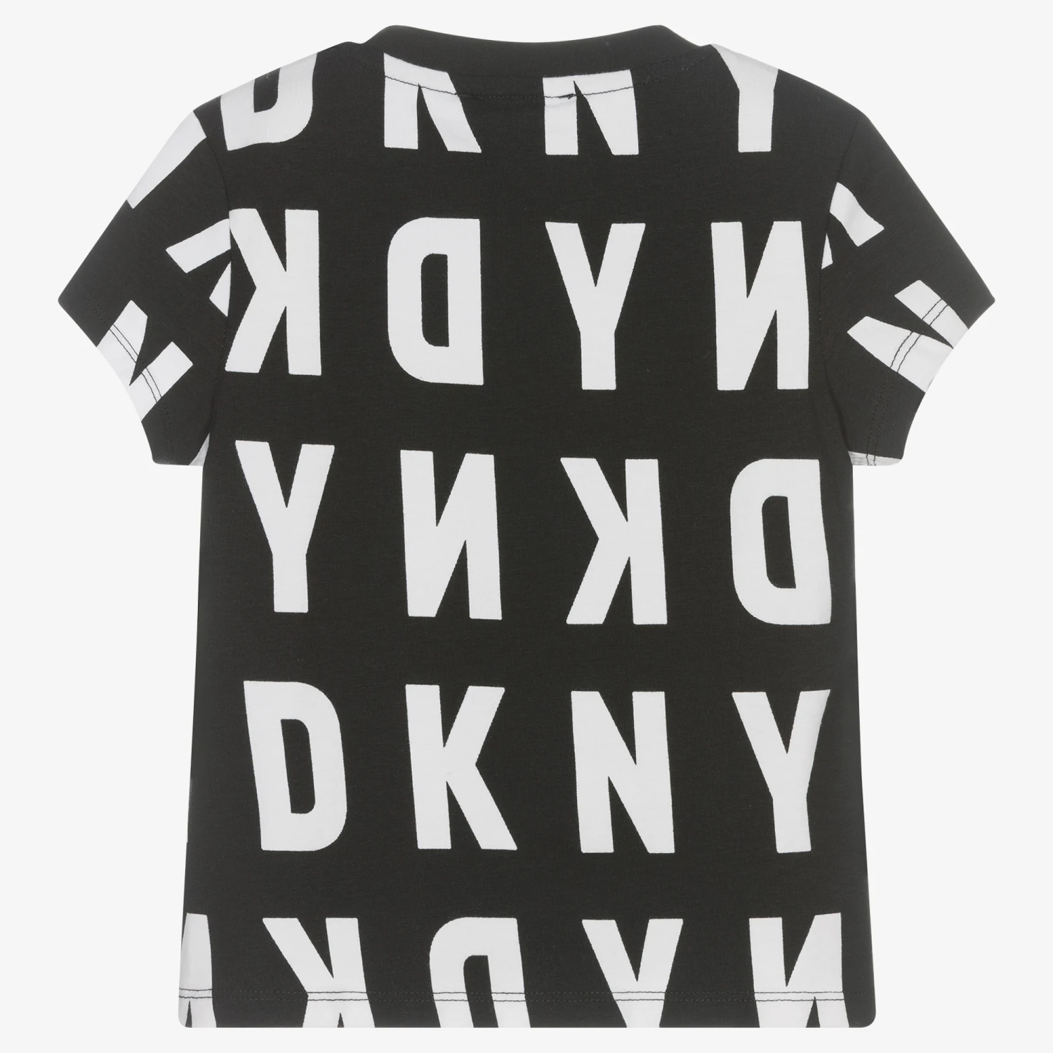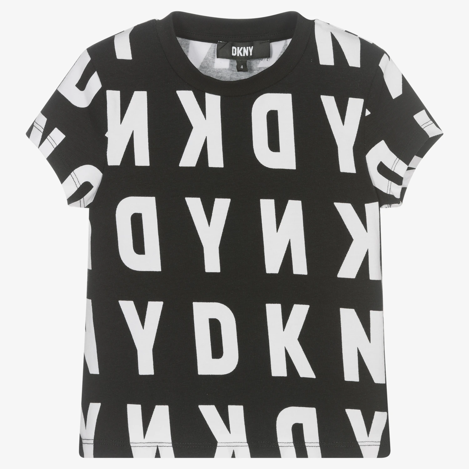 Black fitted T-shirt for girls by DKNY, with an all-over white logo print. Easy and comfortable to wear, it is made in soft cotton jersey.