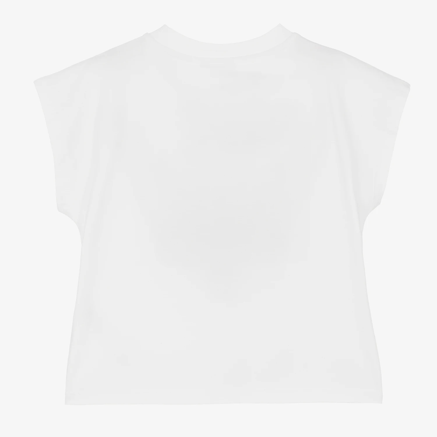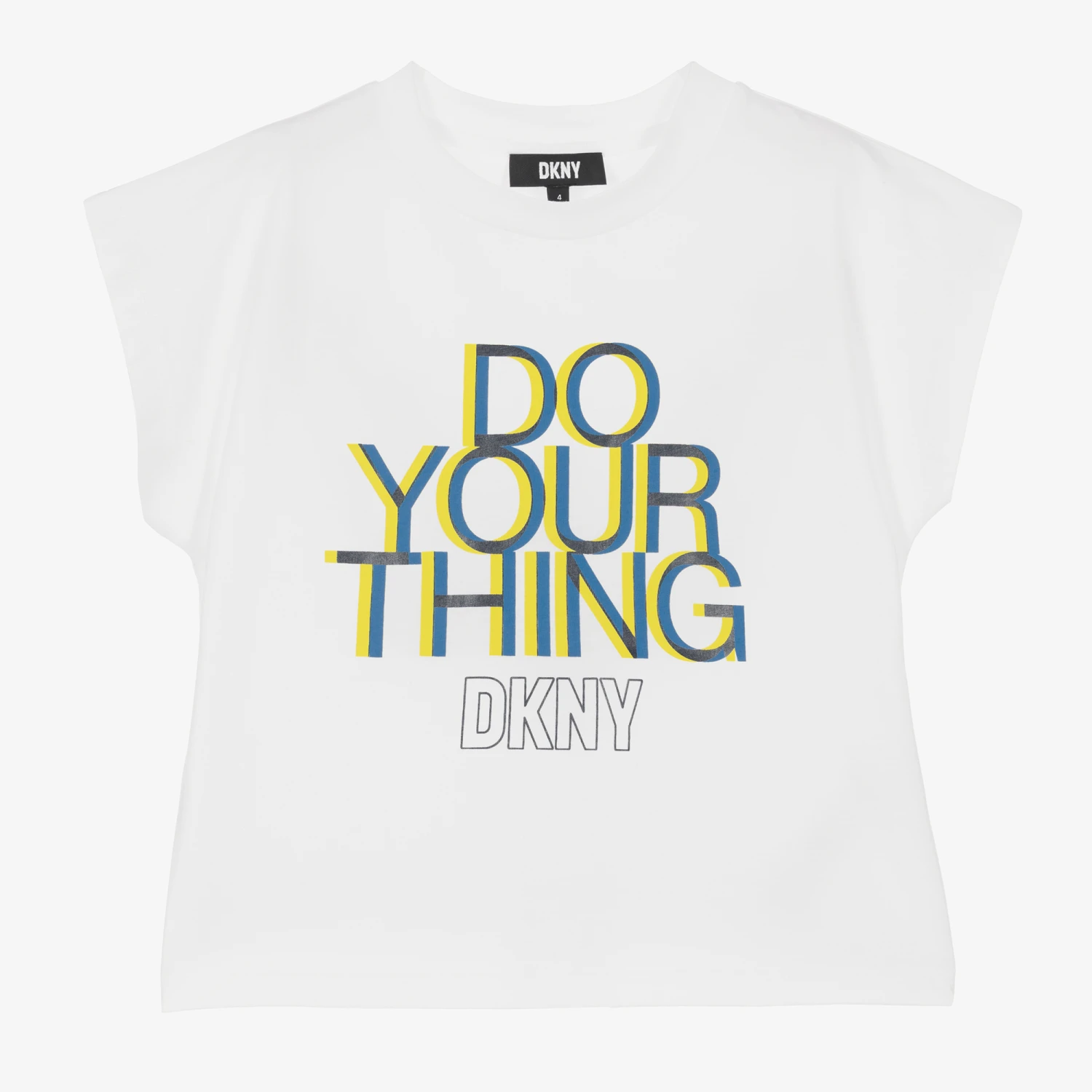 White T-shirt for girls by DKNY, made in soft and comfortable organic cotton jersey. In a fun boxy style, it features a bold blue and green slogan print on the front.