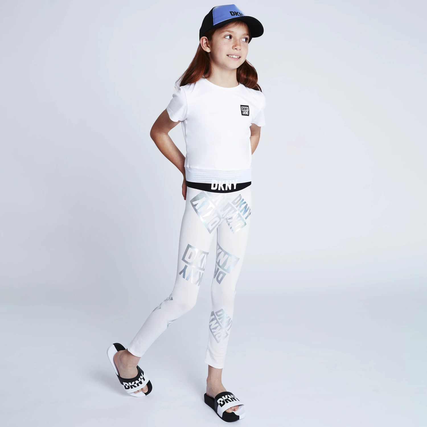 Off white leggings for girls by DKNY, made in soft and stretchy fabric. For an unmistakable designer touch, they have an all-over logo design in a metallic silver iridescent print. They are finished with an elasticated tape waistband with raised logo branding in contrast white.