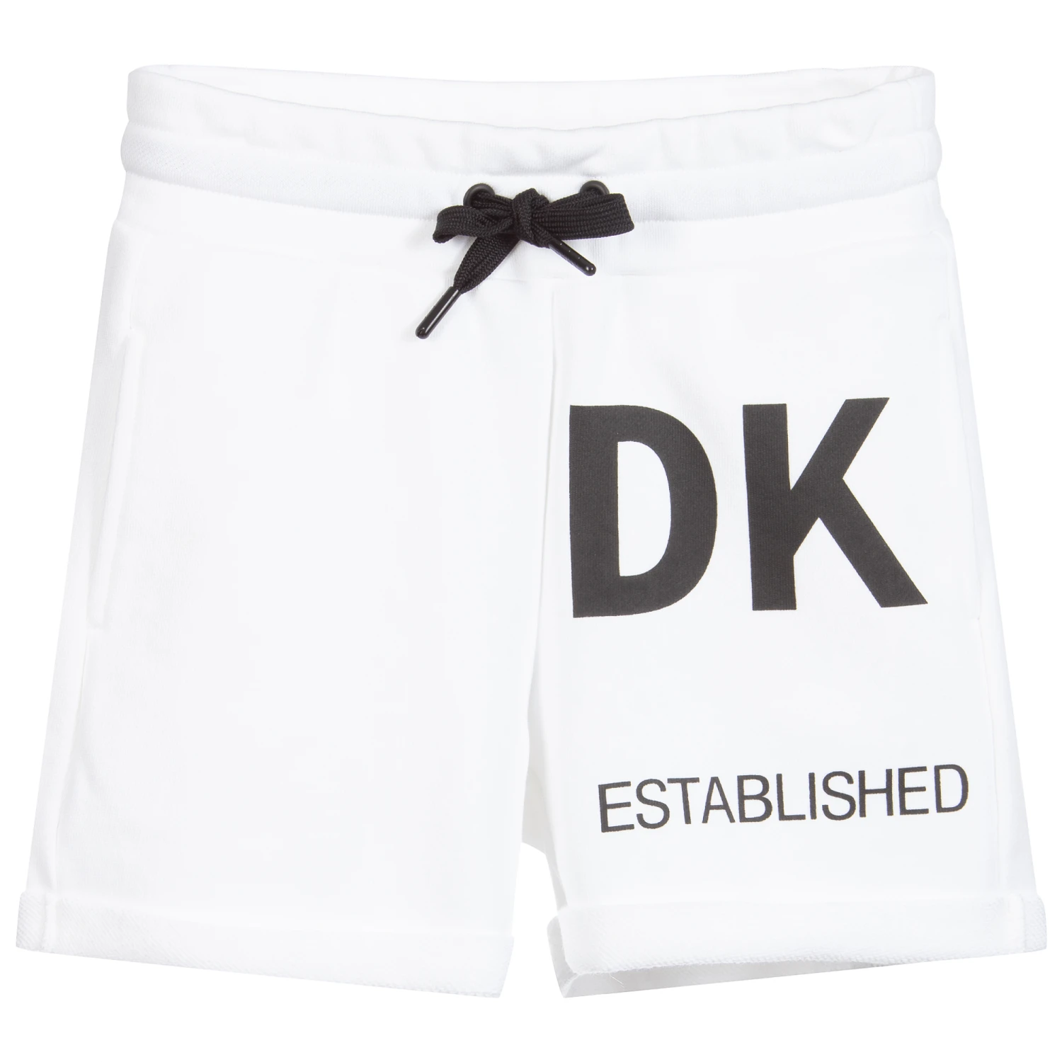 Girls white cotton jersey shorts by DKNY, with black logo print on the front and back. soft and stretchy, they have side pockets and an elasticated waistband with a black drawstring.