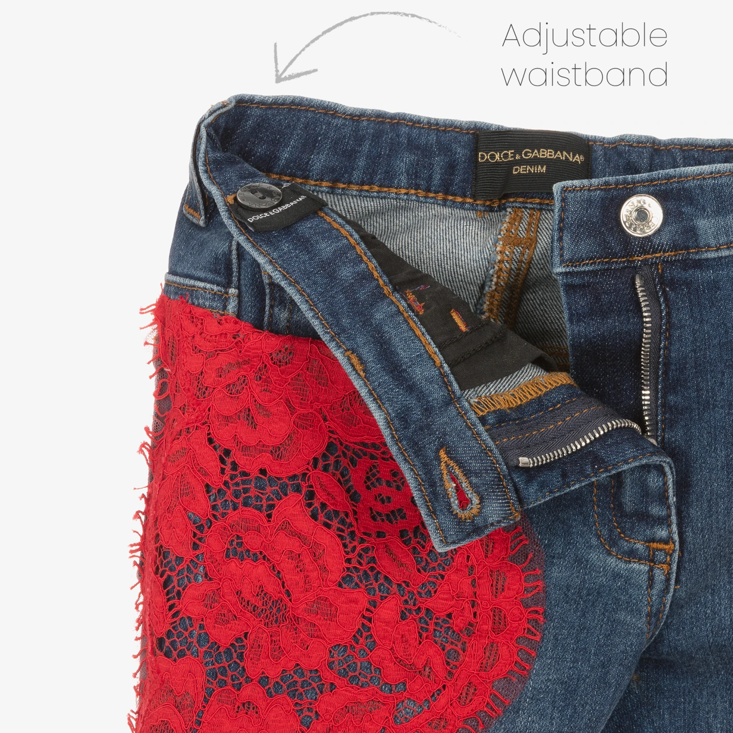 Unique blue denim jeans for girls by luxury Italian designer Dolce & Gabbana. Fitted with an adjustable waist, these straight-leg jeans are elevated with deep red lace trims for a strong visual impact. They fasten with a branded button and zip on the front and feature five useful pockets. A metal and leather logo plaque can be seen on the back for a signature finish.