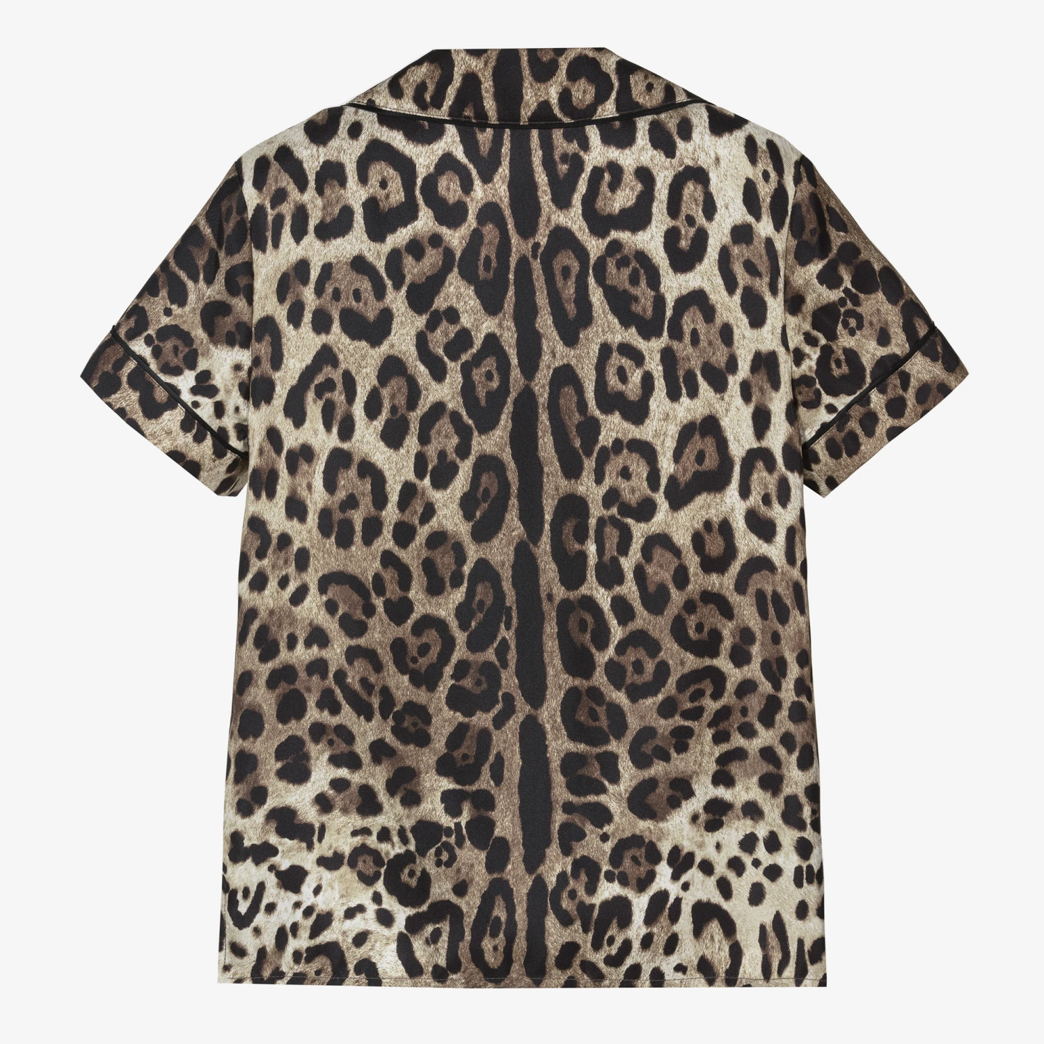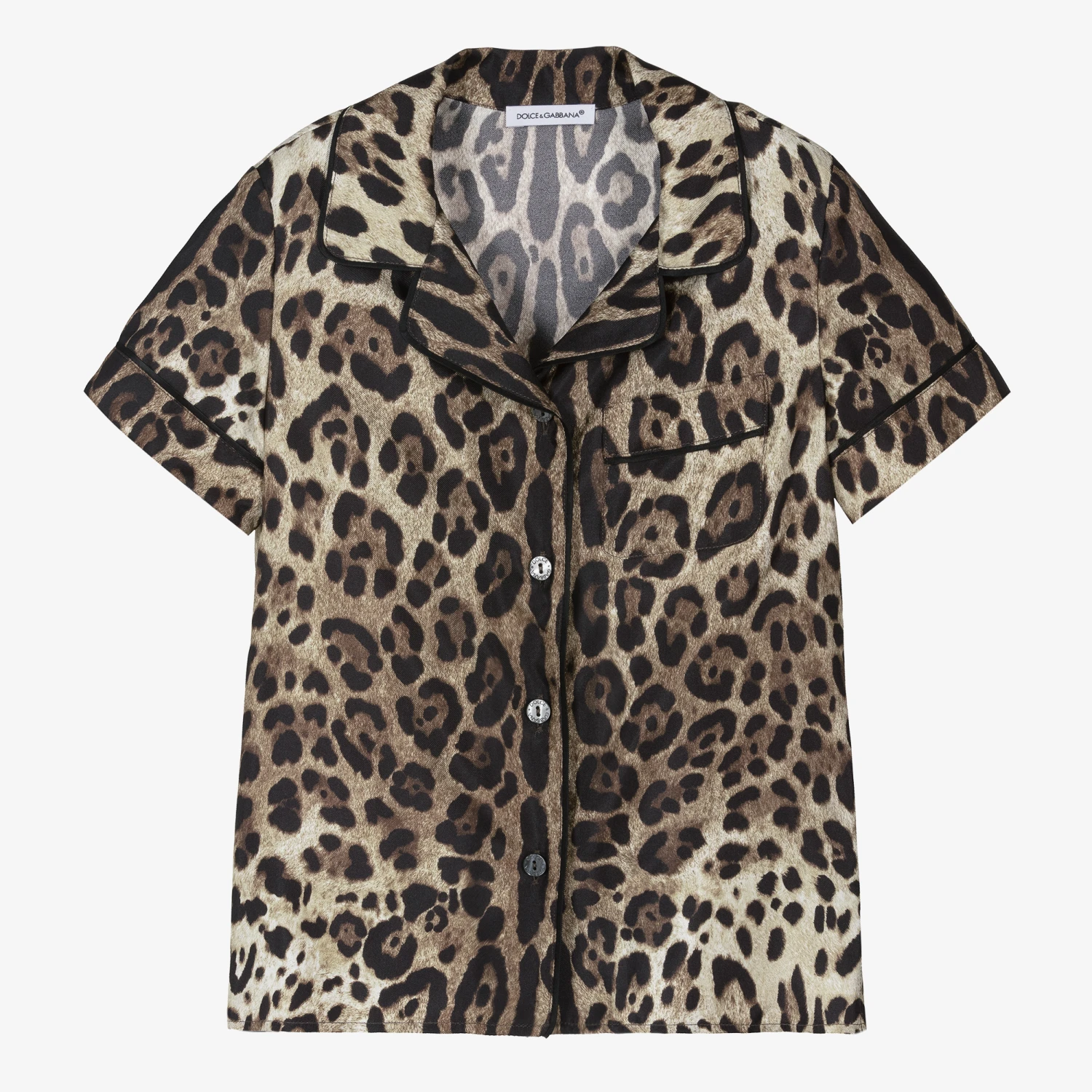 Brown, black and beige shirt for girls by Italian luxury designer Dolce & Gabbana, designed in an iconic leopard print. Crafted from luxurious and lightweight silk, this collared shirt is styled with sleek black trims and a patch pocket on the chest. It fastens with branded, iridescent buttons on the front for an understated designer detail.