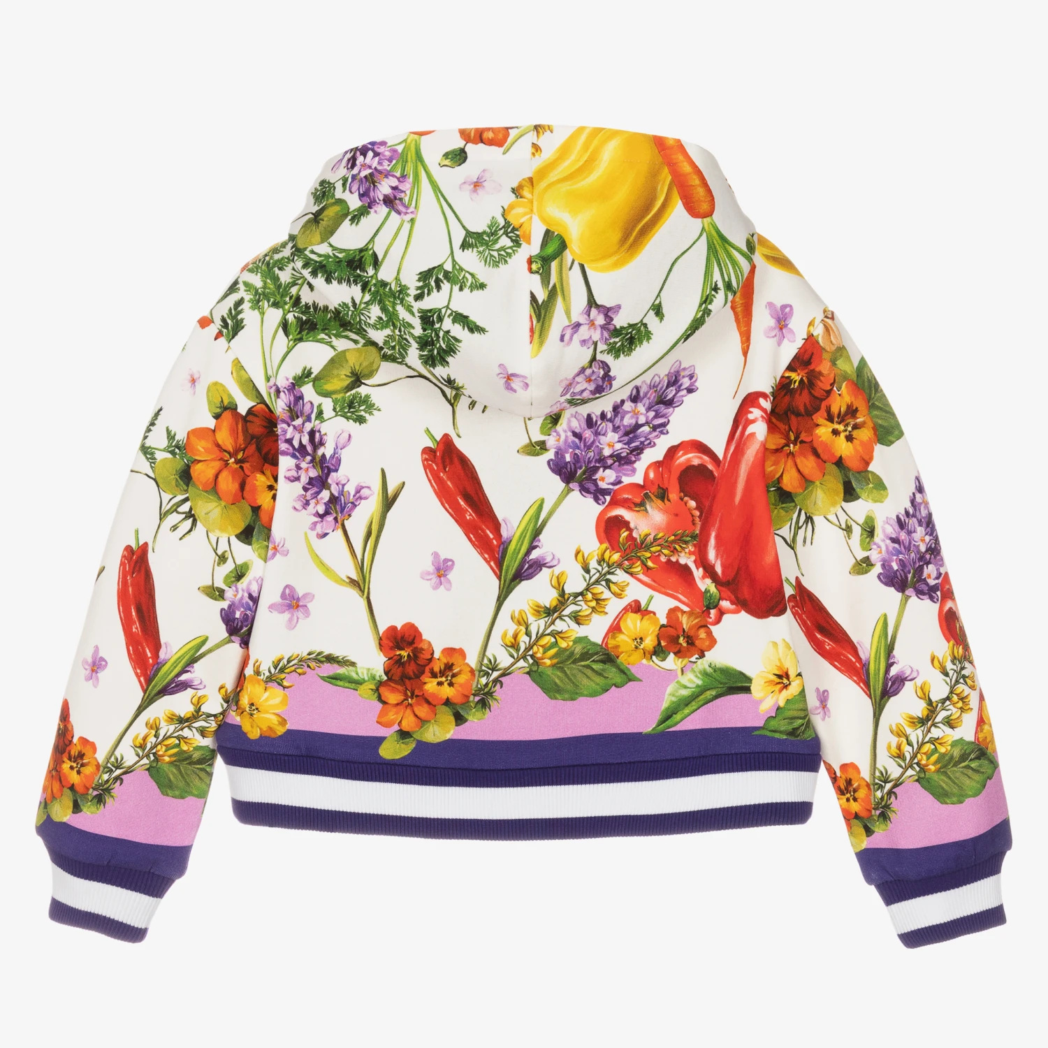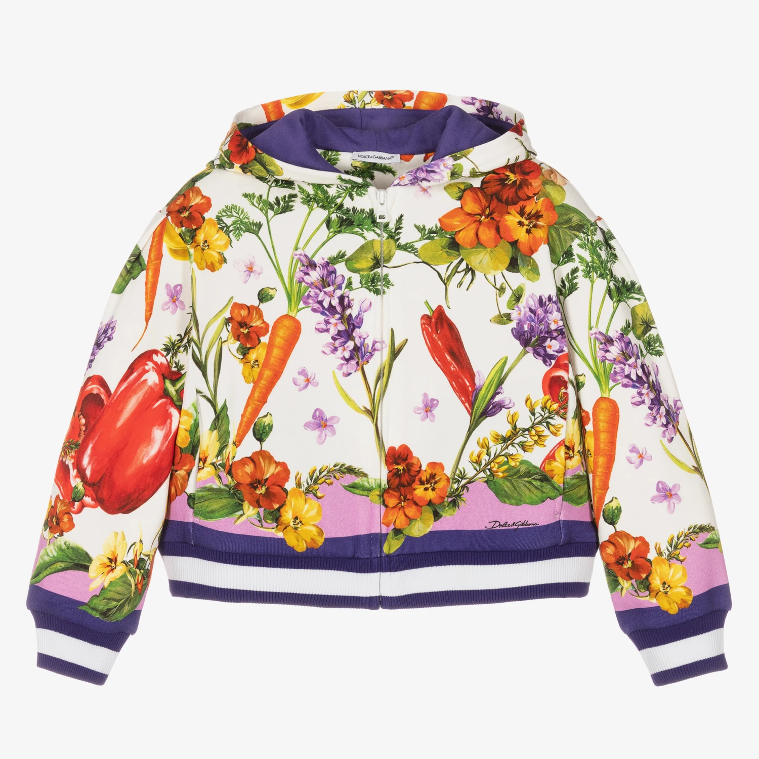 Inspired by a charming Sicilian garden, this white and purple zip-up hoodie for girls is designed by luxury fashion House Dolce & Gabbana. Made in comfortable cotton jersey, this playful style has a colourful vegetable and floral print all-over. The tonal purple and white ribbed stripes offer a sporty twist to this everyday style. Unmistakable D&G, this stand-out piece adds a touch of luxury to your child’s casualwear collection.
