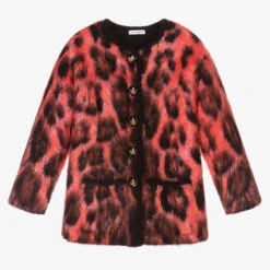 From luxury Italian brand Dolce & Gabbana and directly inspired by their adult collection, a gorgeous coral red and black leopard print cardigan for girls. This oversized, heavy-knit style is made in beautifully soft mohair with an iridescent effect, and has a silky satin lining. Fastening with concealed poppers, it has stylish black and gold logo buttons on the front, with large patch pockets.