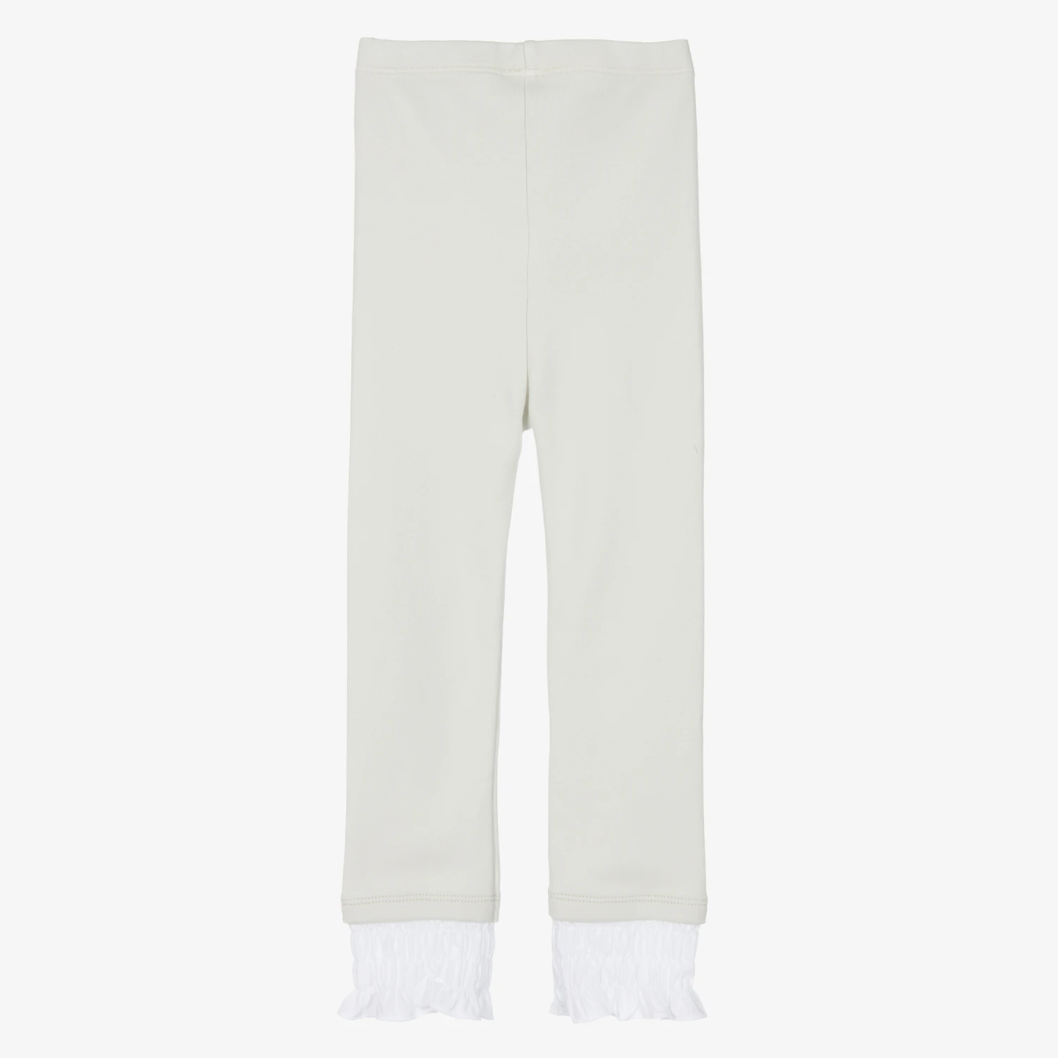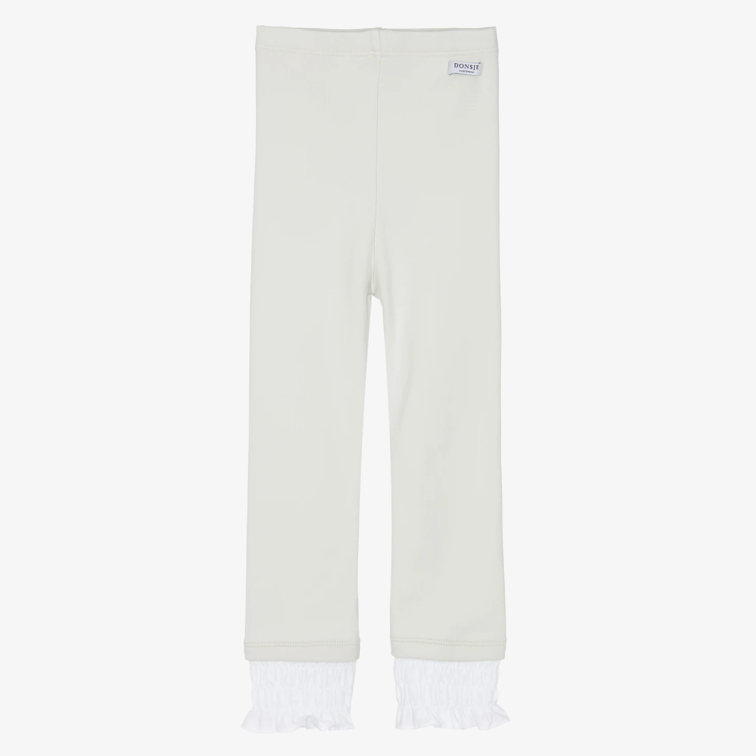 Girls pale silver grey, organic cotton leggings by Donsje, with pretty white cotton cuffs. Handmade in soft and stretchy jersey for a comfortable fit. These mid-weight jersey leggings are full length and have a small branded tab on the front, for an added designer touch.