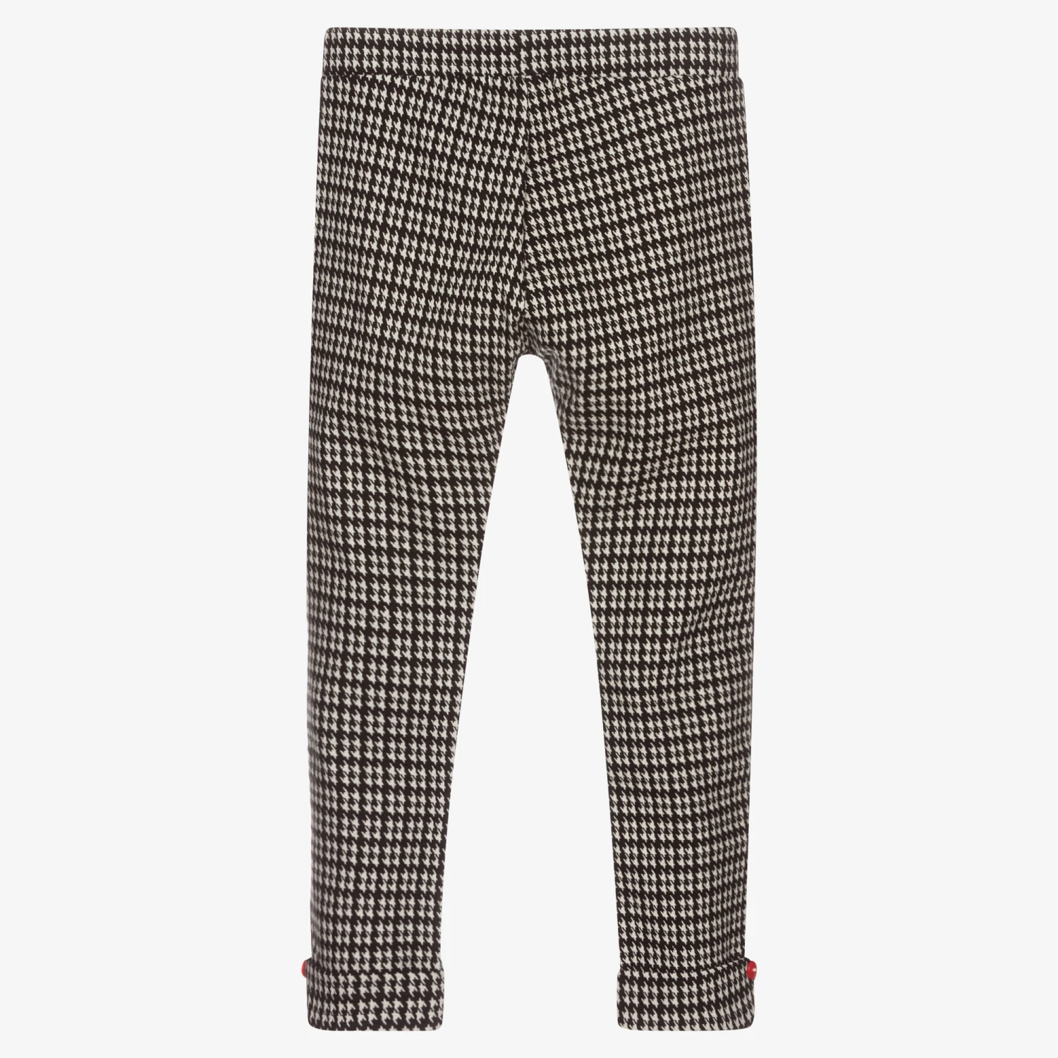 Younger girls black and white houndstooth check leggings by Dr. Kid. Made in soft and stretchy cotton blend jersey, they have turn-ups with decorative buttons for a smarter look.