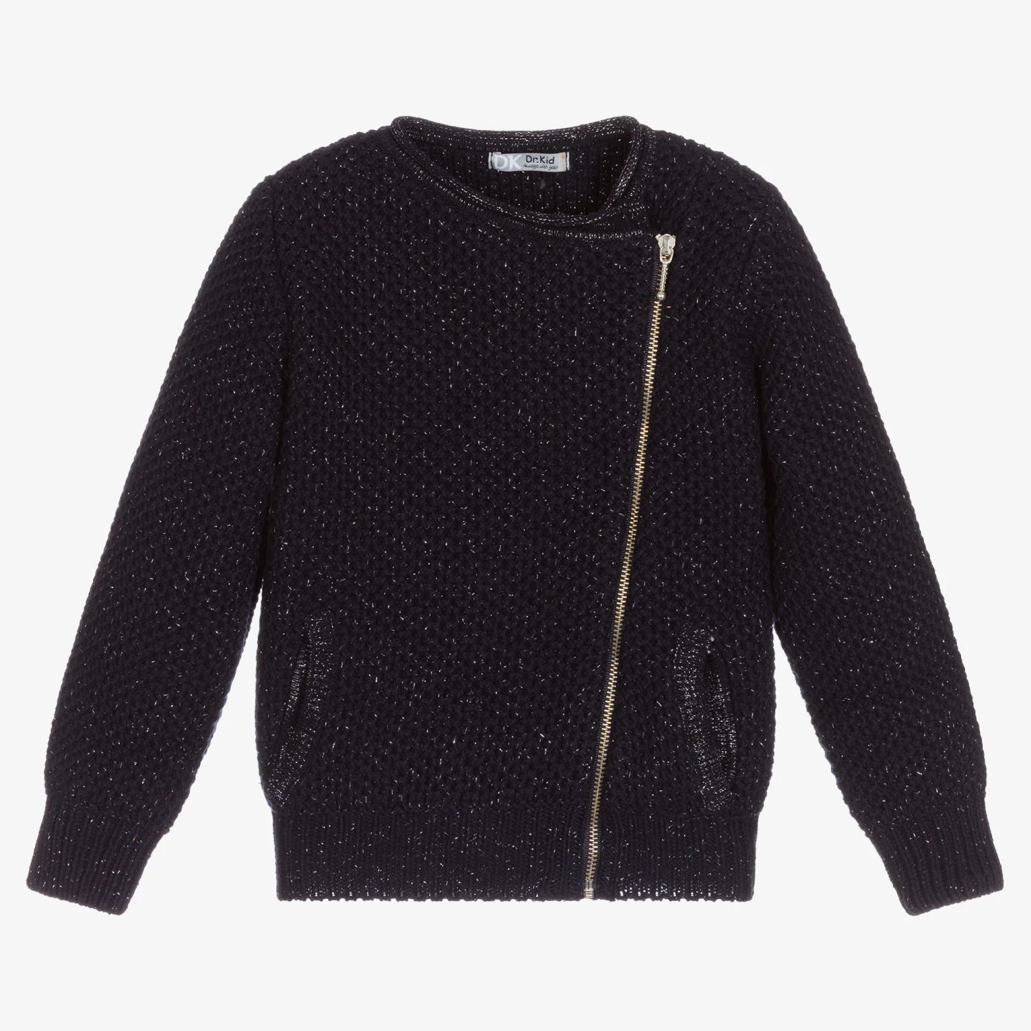 Girls navy blue zip-up cardigan from Dr. Kid, with a sparkly silver thread. It is knitted in a chunky wool and cotton blend, with a rolled collar, side zip fastening and front pockets.