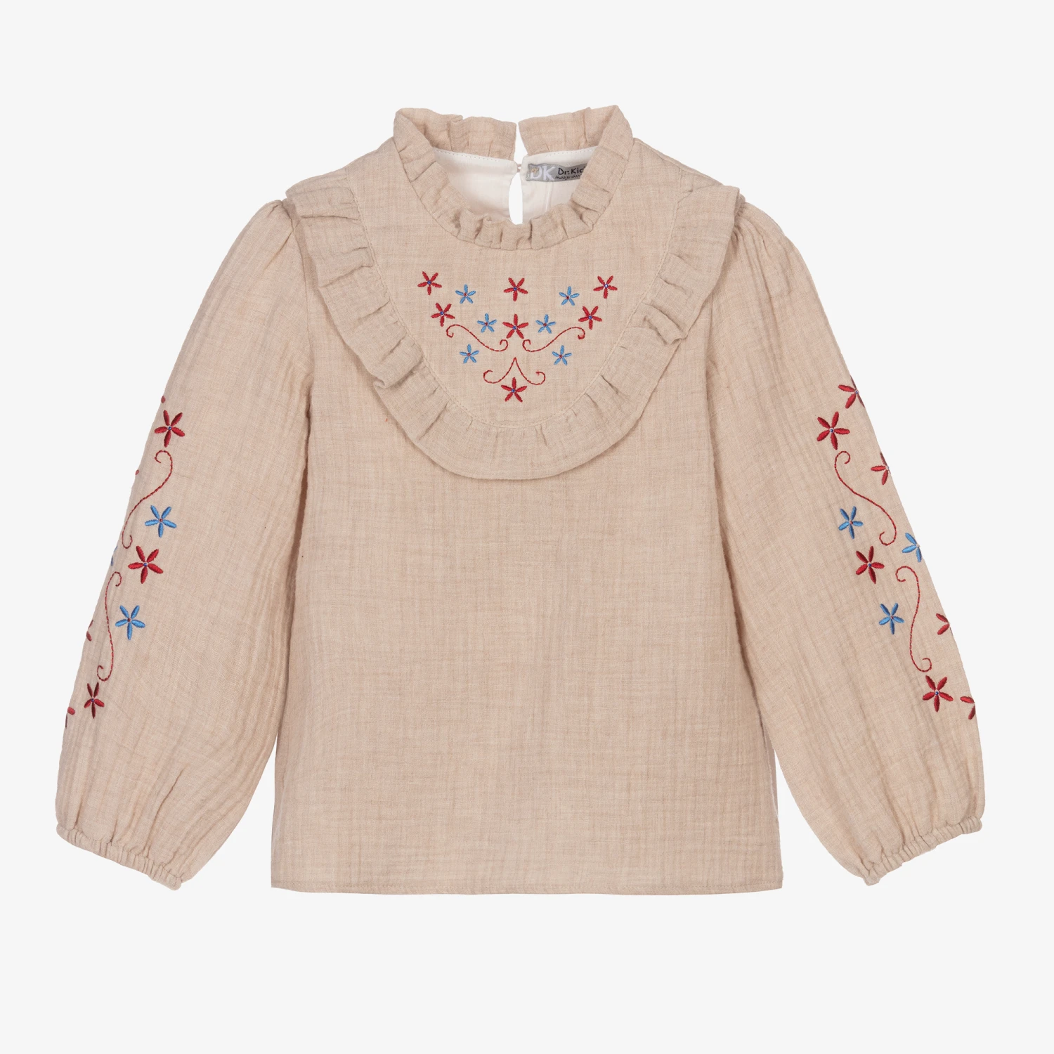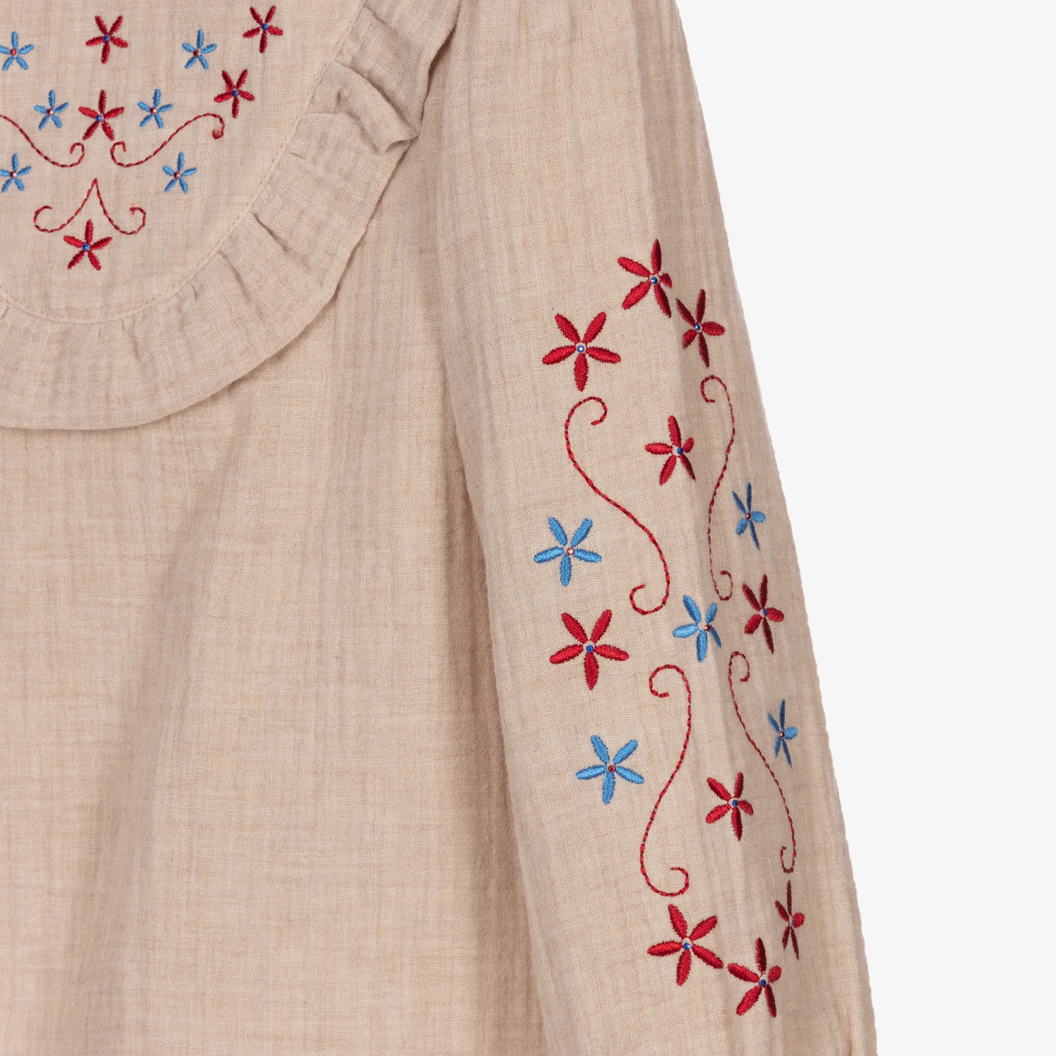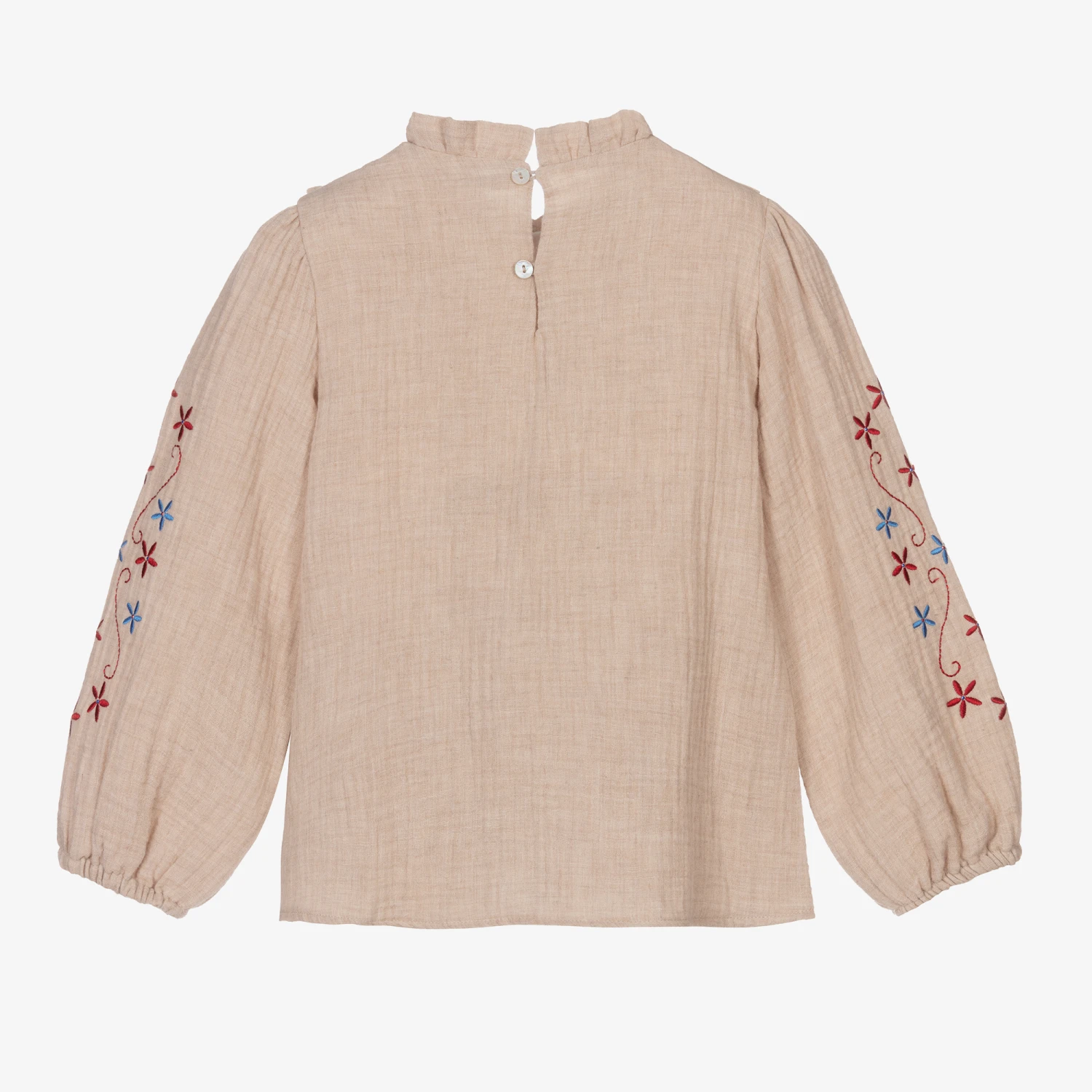 Beige blouse for girls by Dr. Kid, made in soft mid-weight organic cotton cheesecloth. The bodice is lined and it has ruffle trims and pretty red and blue floral embroidery on the sleeves and chest. It has button fastenings on the back and elasticated cuffs on the sleeves.