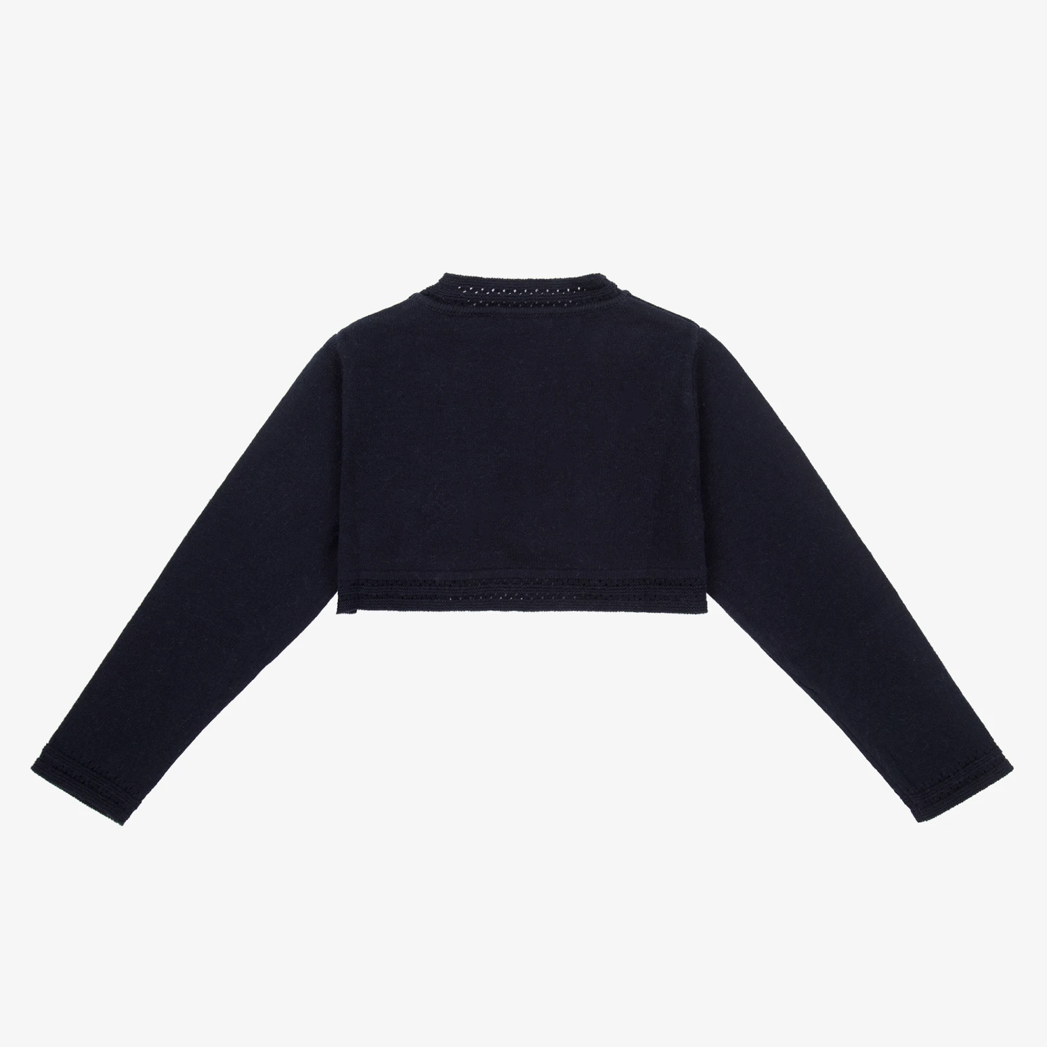 Navy blue bolero cardigan for girls from Dr. Kid. It is knitted in a soft cotton blend with pretty patterned trim.