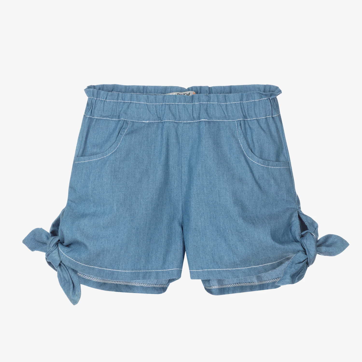 Sweet light blue shorts for little girls by Dr. Kid, made in soft cotton chambray. They have front and back pockets, with pretty knotted ties at the sides. The waistband is gently elasticated for comfort and easy pull on.