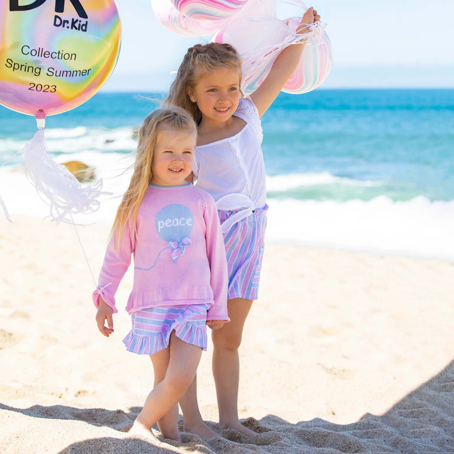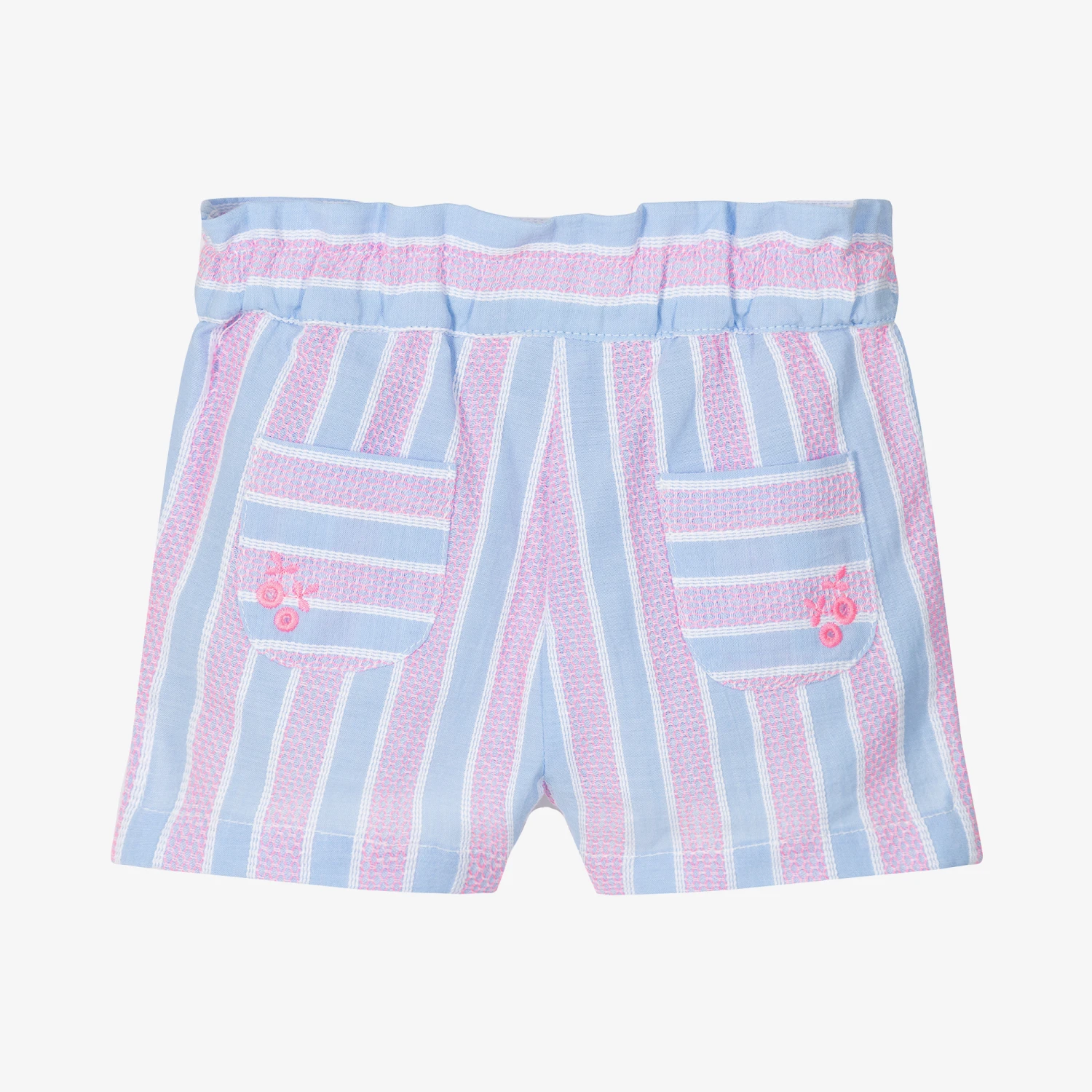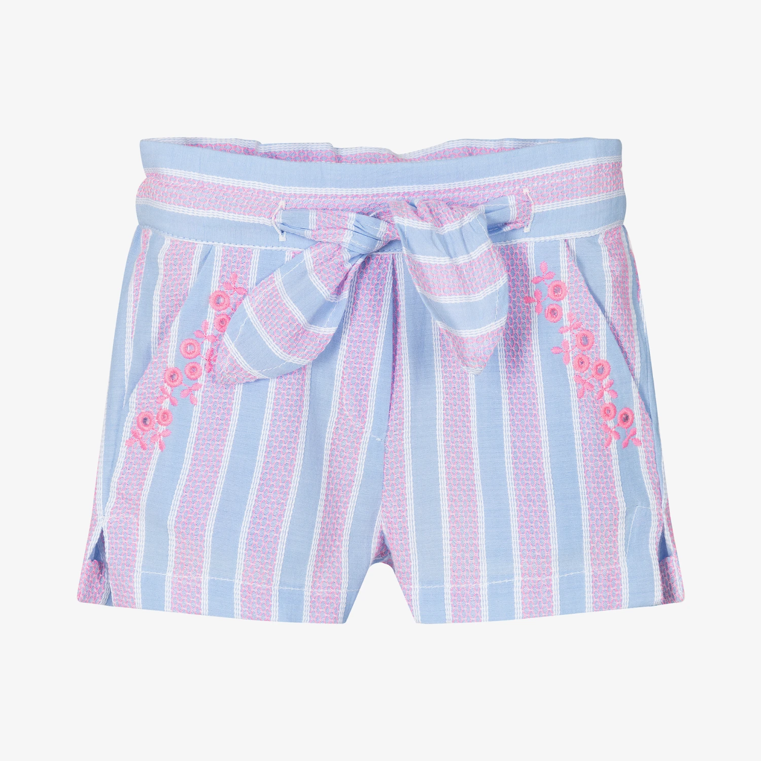Bright blue and pink striped shorts for little girls from Dr. Kid, made in lightweight cotton blend. They have a loose casual cut with an adjustable drawstring waist for a better fit. As well as the pink stitched stripes each of the four pockets are finished with delicate floral embroidery.