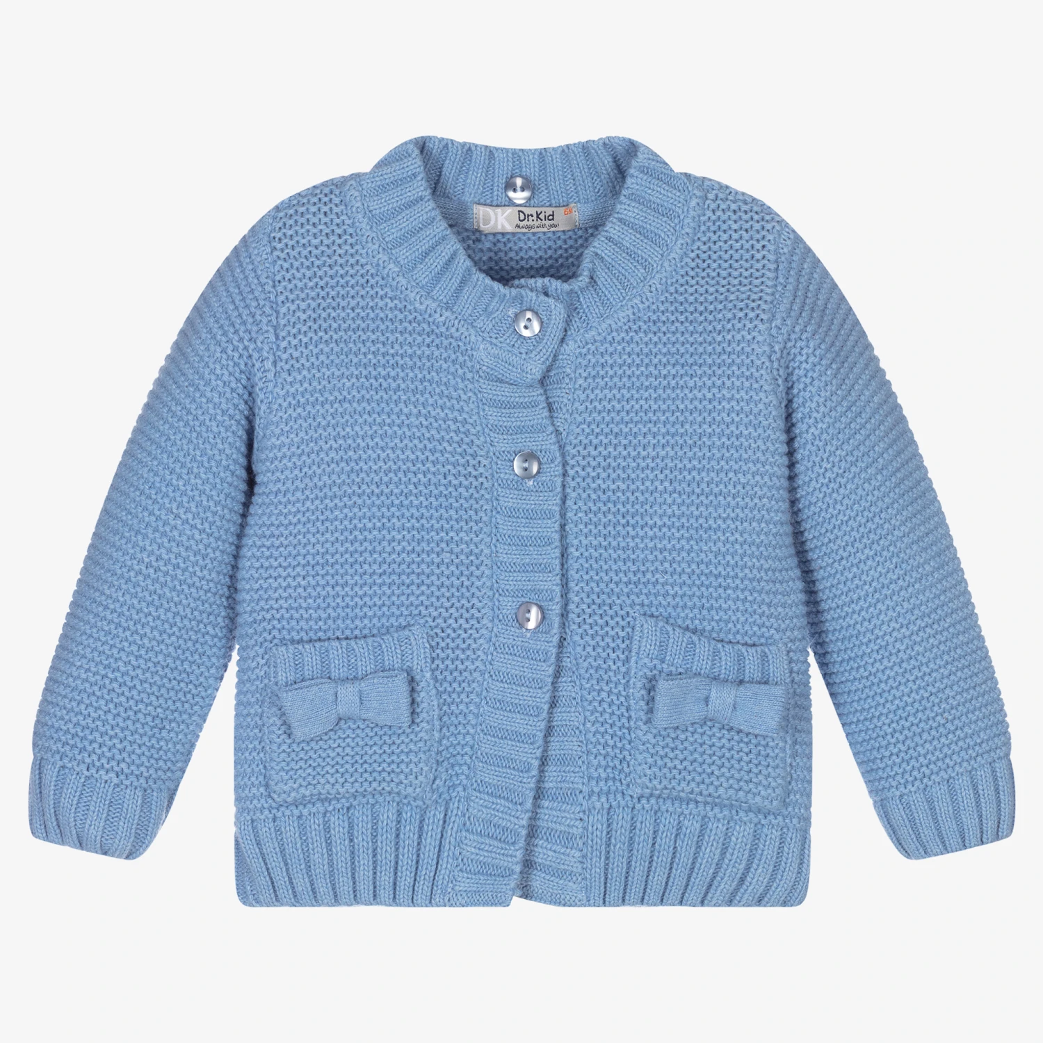 Blue knitted cardigan for younger girls by Dr. Kid, with a detachable faux fur collar. It is made in a soft wool and cotton blend and has little pockets on the front with cute bow detail.