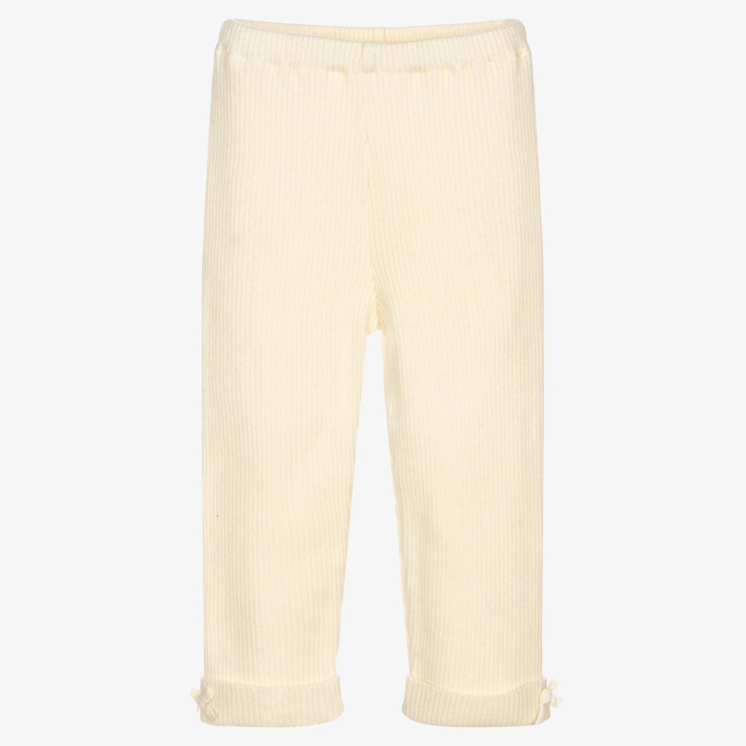 Younger girls ivory ribbed leggings from Dr. Kid. Super soft and warm, they are made in a wool, cashmere and viscose blend, with velvet bows on the turn-up cuffs.