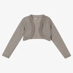 Grey bolero cardigan for girls by Dr. Kid, knitted in a soft cotton and acrylic blend. It has an open front, with pretty patterned trim along the borders.