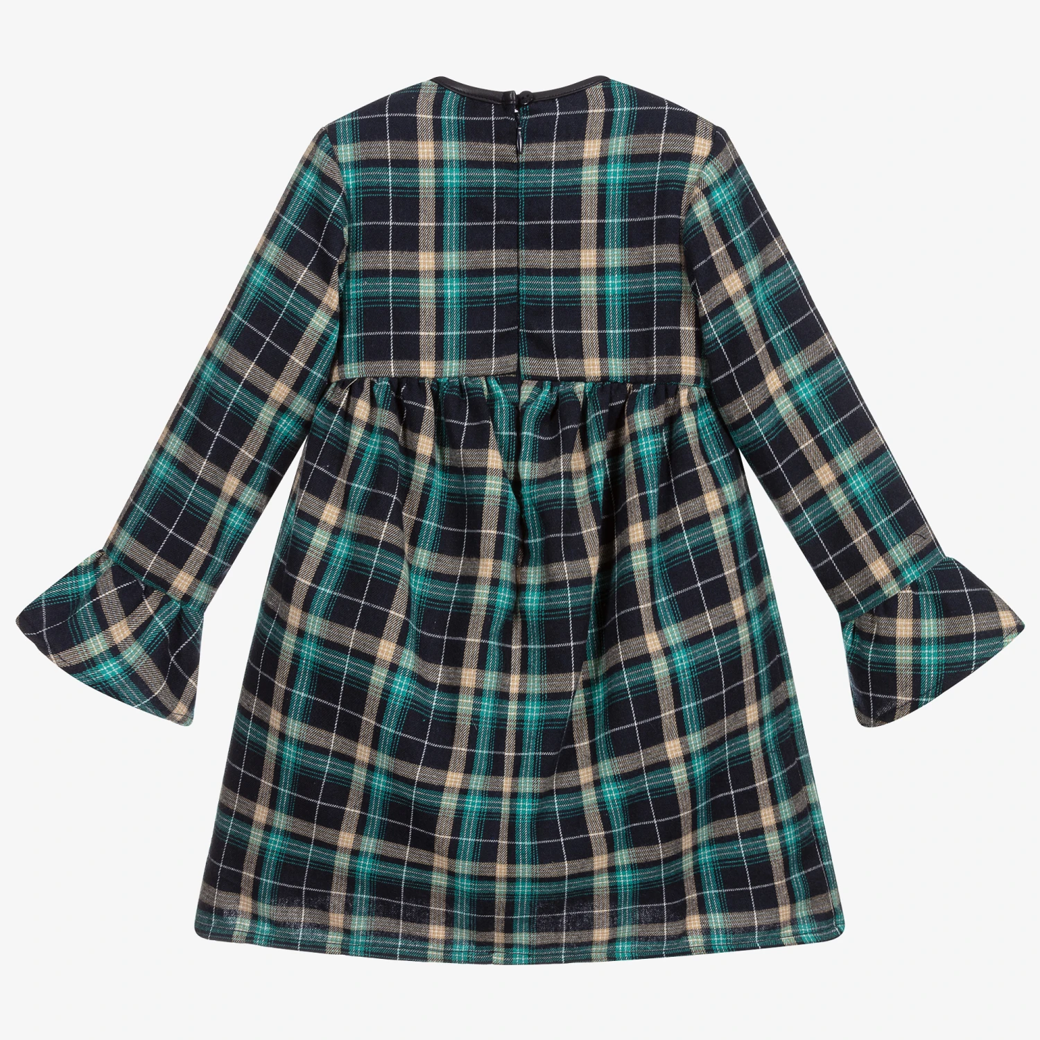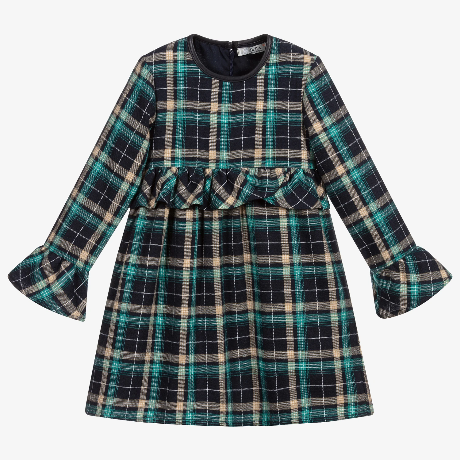 Girls navy blue, green and beige checked dress by Dr. Kid. It is made in soft, brushed cotton twill with a lightweight lining and back zip fastening. The dress has faux leather trim around the neck, flared cuffs and a pretty frill on the front waist. The hem is slightly longer at the back.