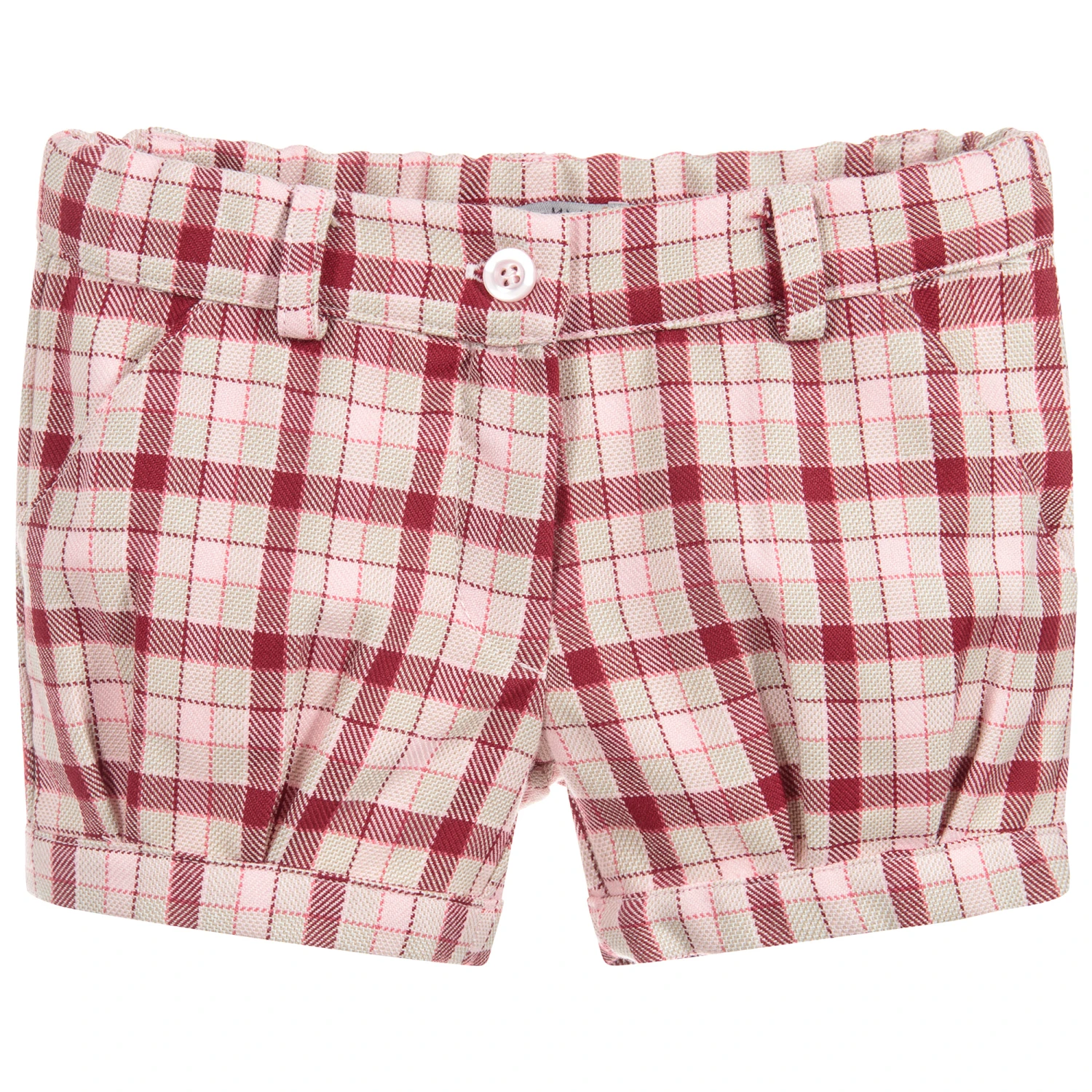 Pink and red check shorts for little girls by Dr. Kid. They have two side pockets and fasten on the front with a small button. They also have an elasticated, adjustable waistband, ideal for growing little girls.