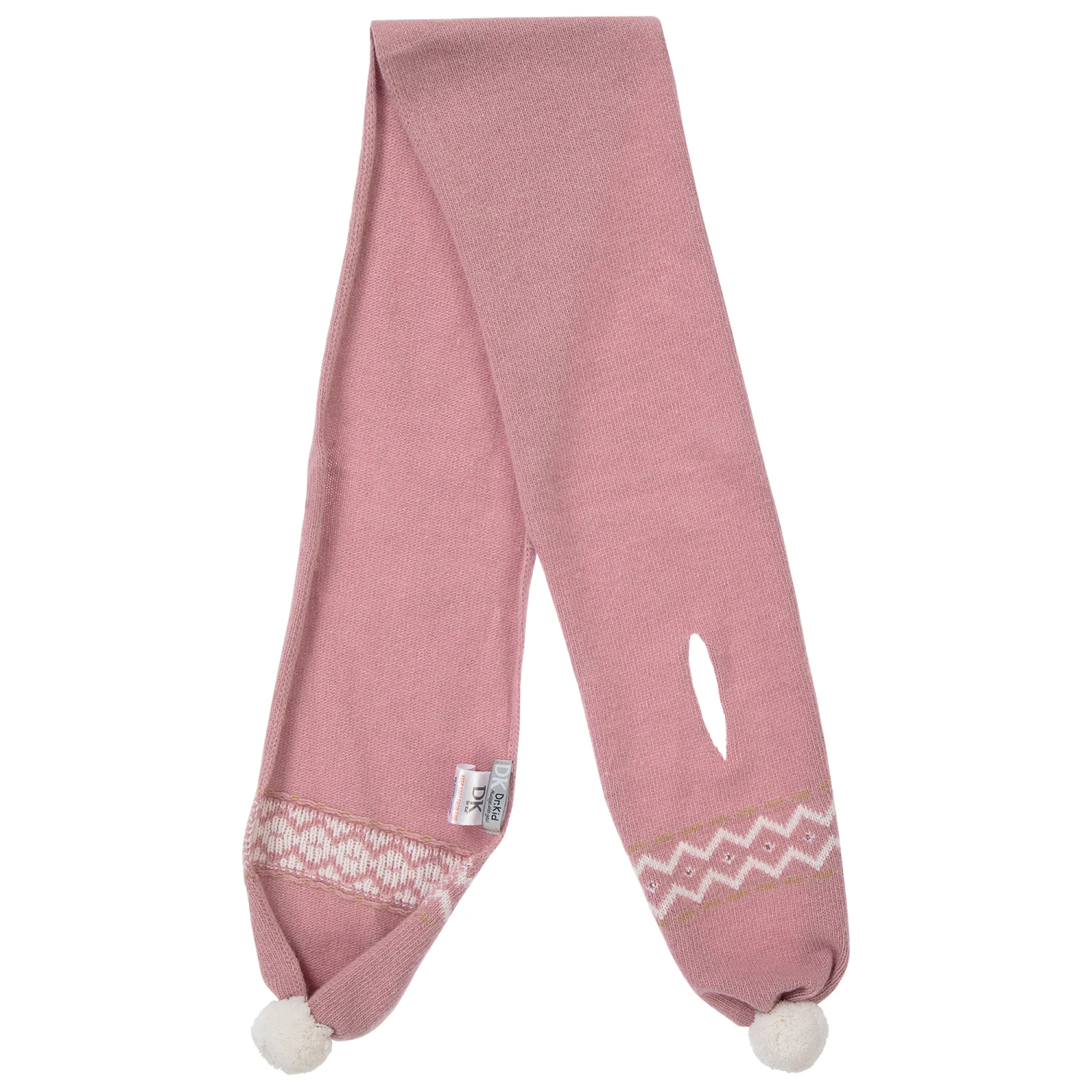 Girls pink hat and scarf set by Dr. Kid, knitted in a soft wool and cotton blend. Both pieces have ivory pom-poms and zigzag pattern with tiny pink diamanté studs. The scarf has a useful slit to push the pom-poms through and help keep it neatly in place.