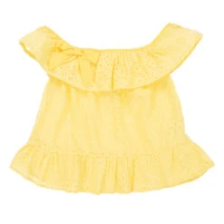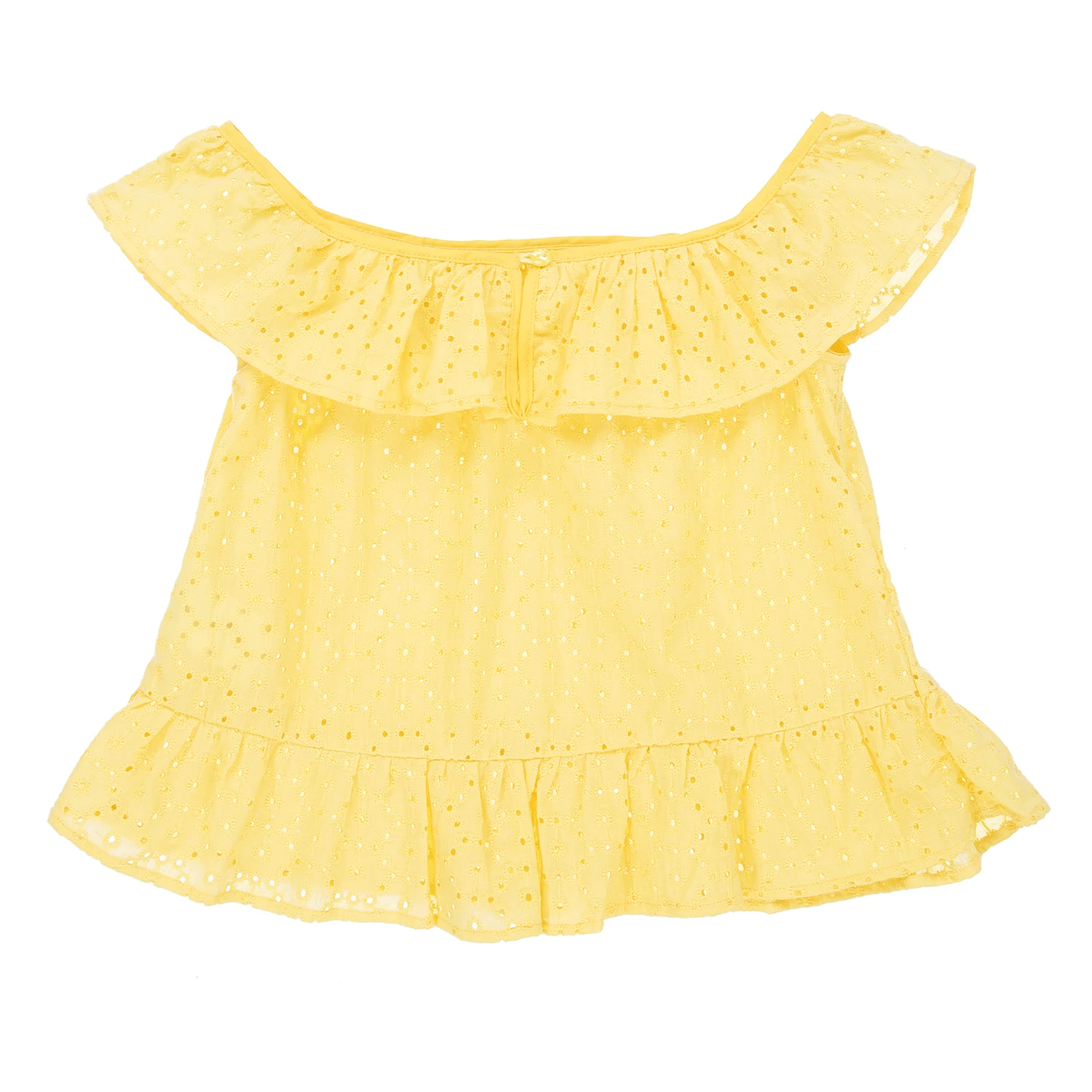 Beautiful yellow blouse for girls in cotton broderie anglaise, by Dr. Kid. It has a ruffled frill around the top and on the hem, and a yellow bow detail on the neckline. There is a single button fastening on the back.