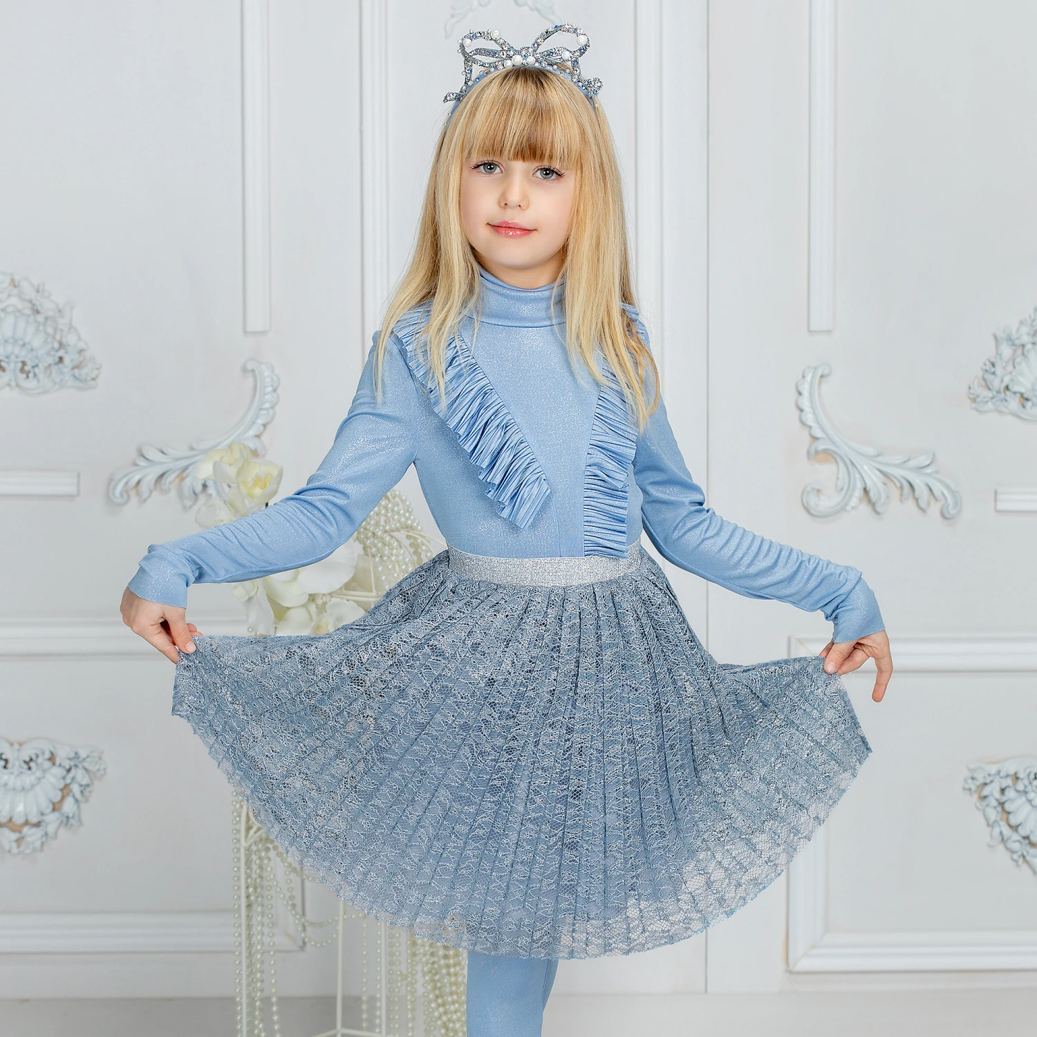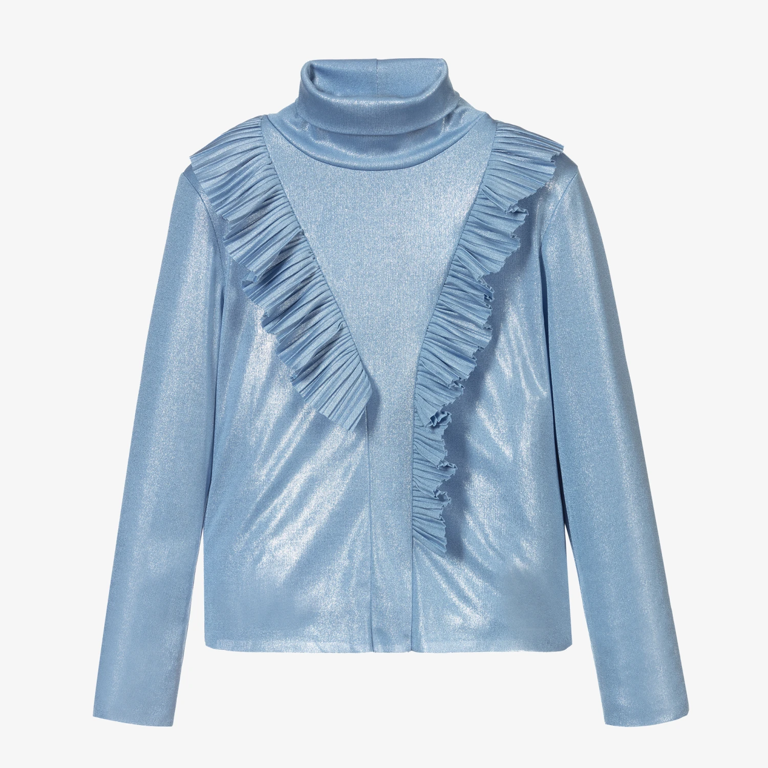 Girls blue turtleneck top from luxury designer Eirene, with a metallic sheen. It is made in super-soft and silky jersey, with ruffles and raw-edged seams.