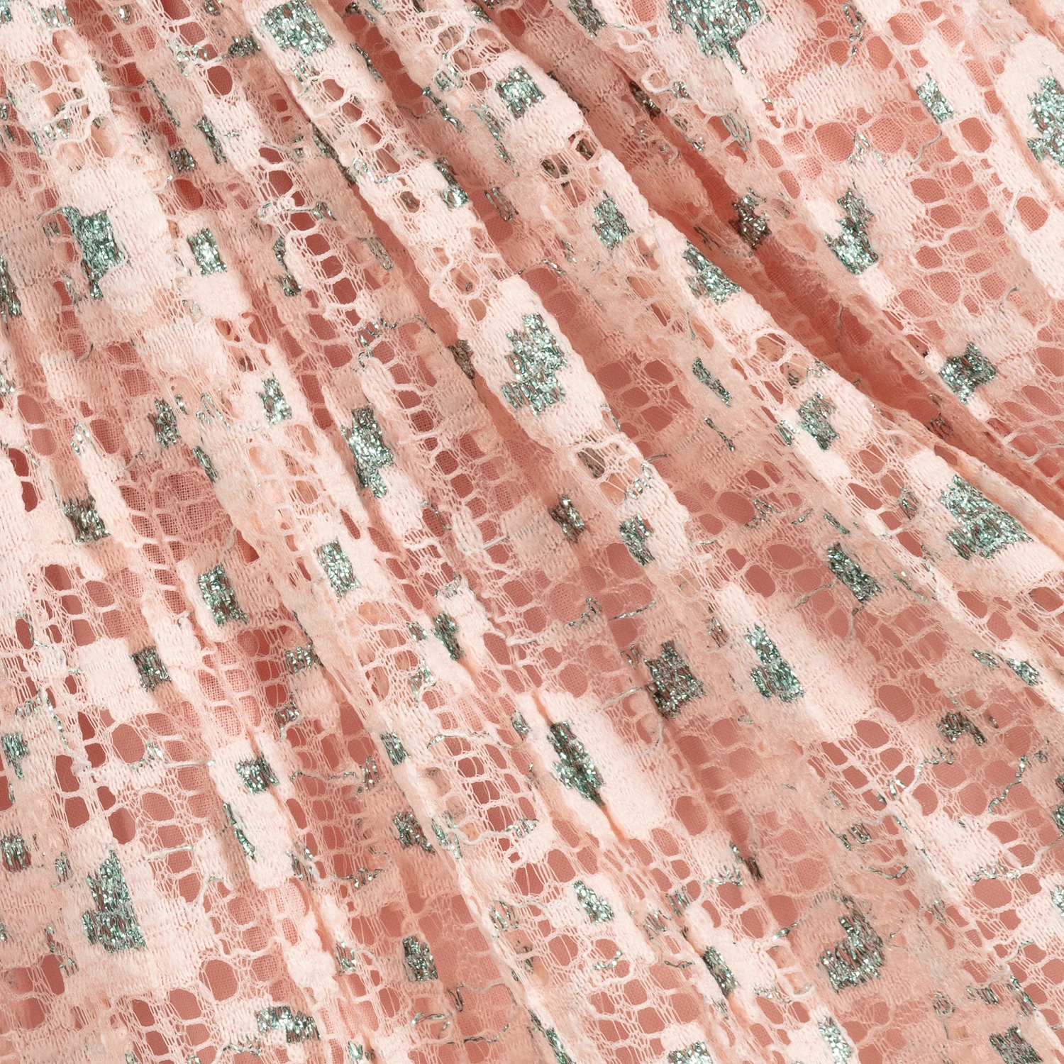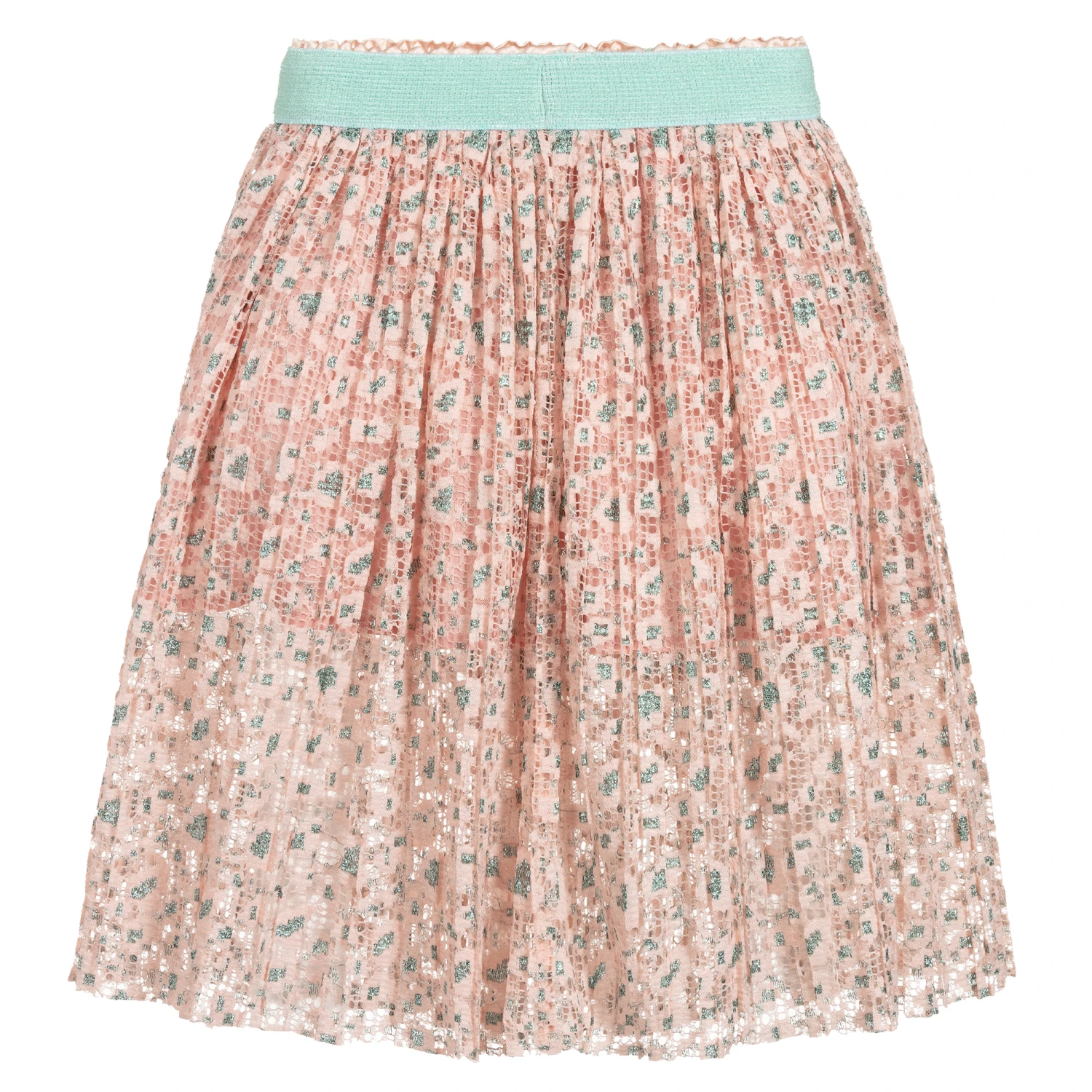 Pretty pink and metallic blue skirt by Eirene, made in soft, stretchy lace. Easy to wear, it simply pulls on and has an elasticated, turquoise waistband.