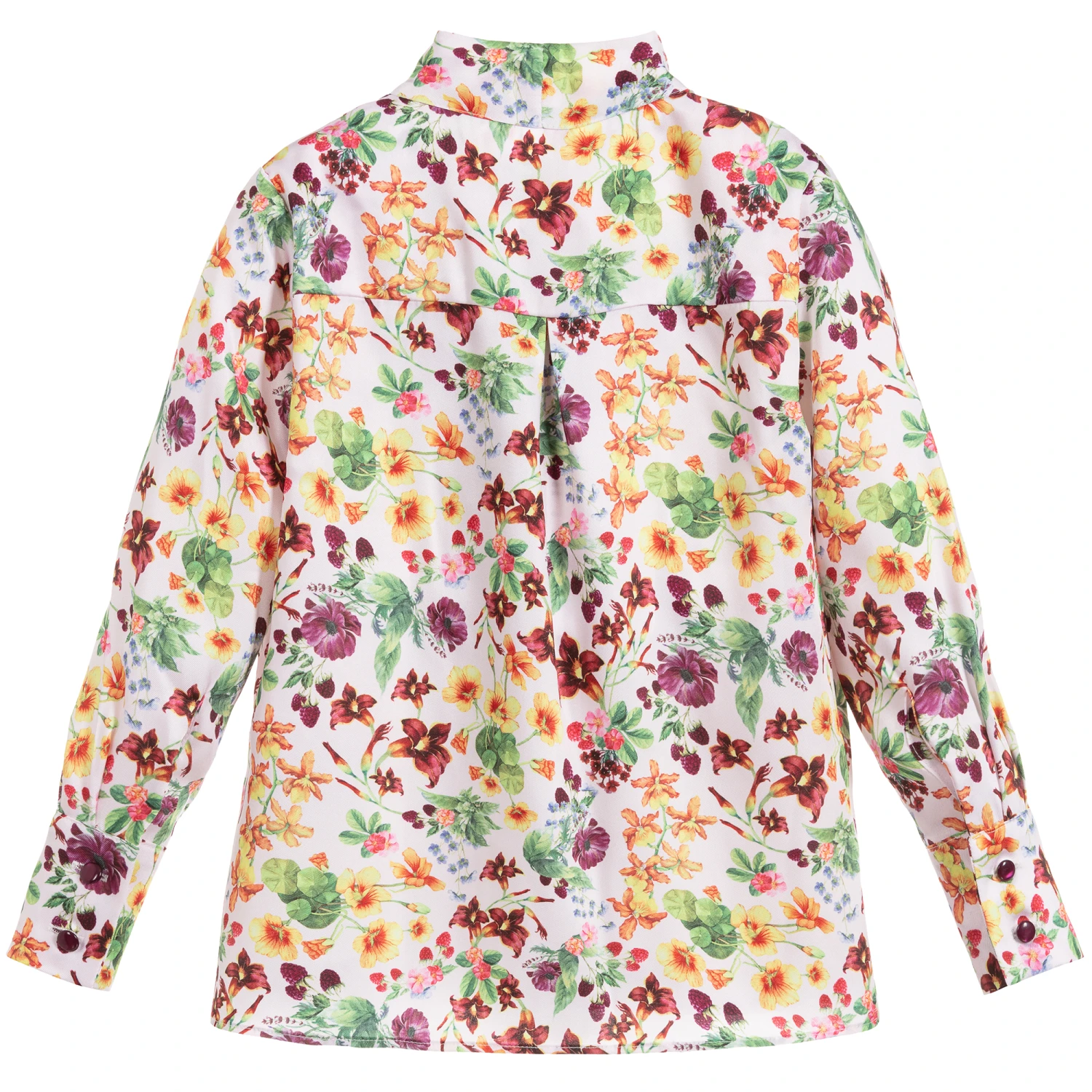 Smart satin blouse for girls by Eirene, with a pink base and a beautiful yellow, burgundy red, pink and green floral pattern. It has an elegant bow tie around the neckline and pearlised burgundy red button fastenings.