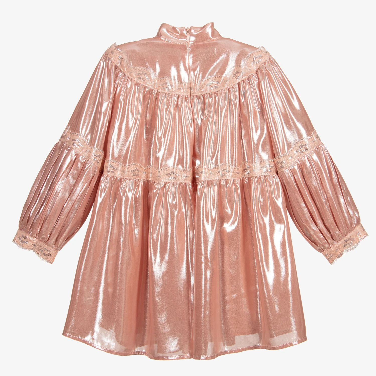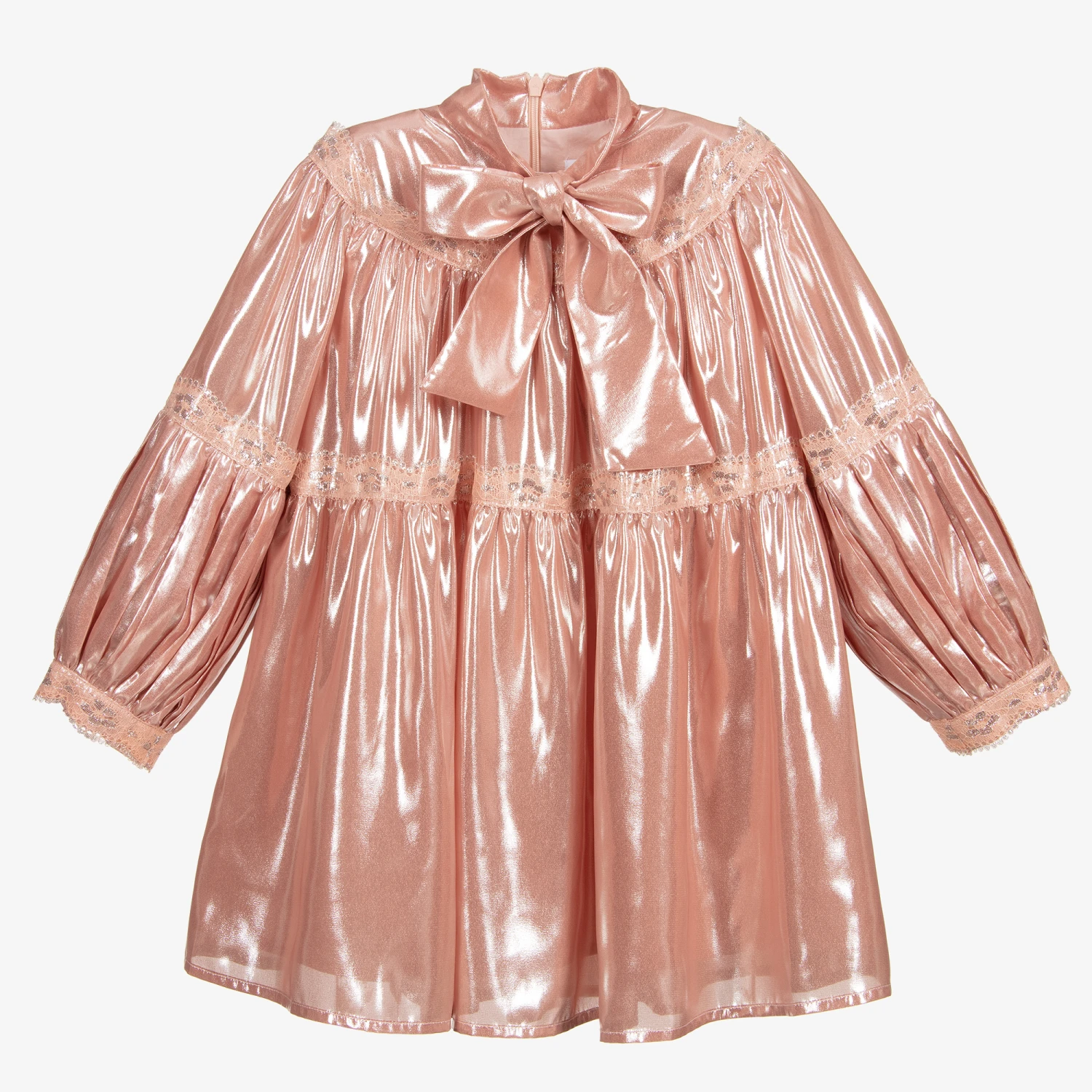 Dusky pink dress for girls by Eirene. Soft and lightweight, this shimmering metallic dress has pretty lace trims, a bow tie and a concealed back zip fastening.