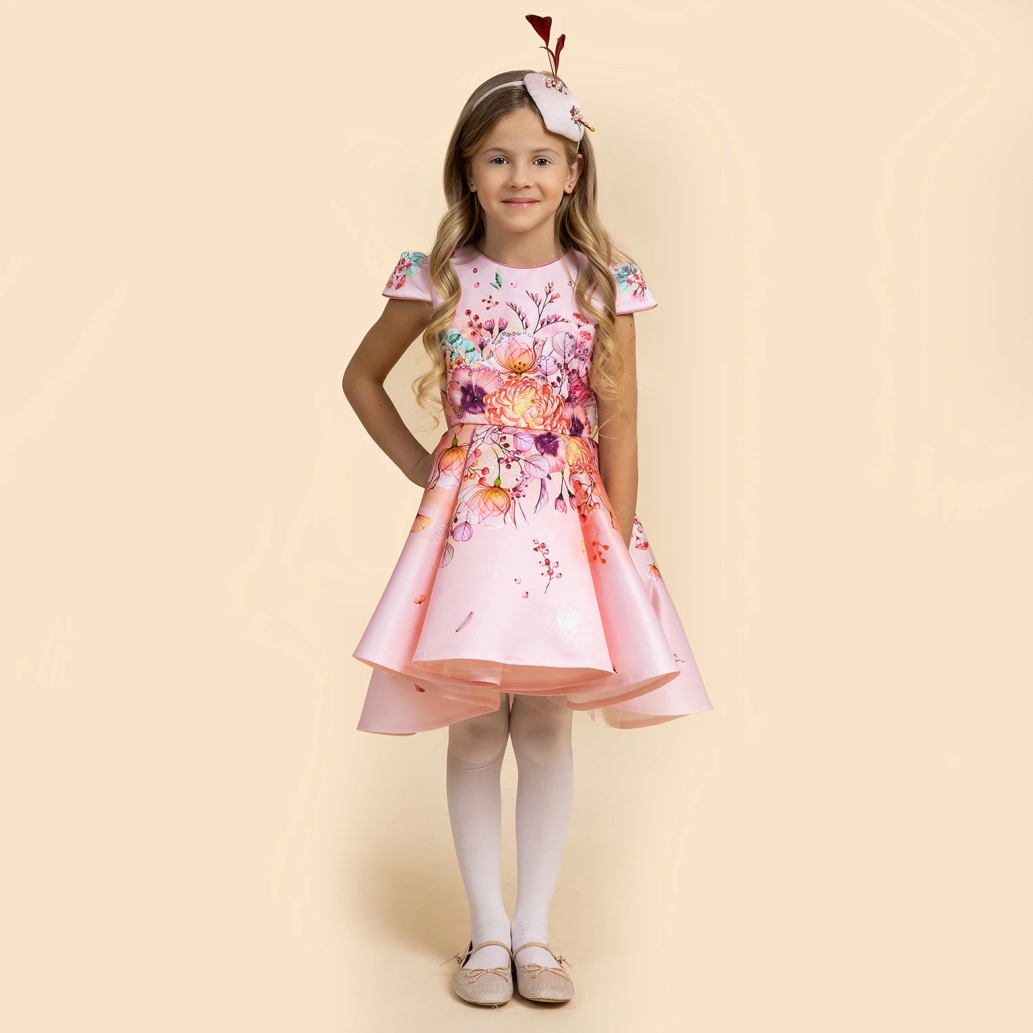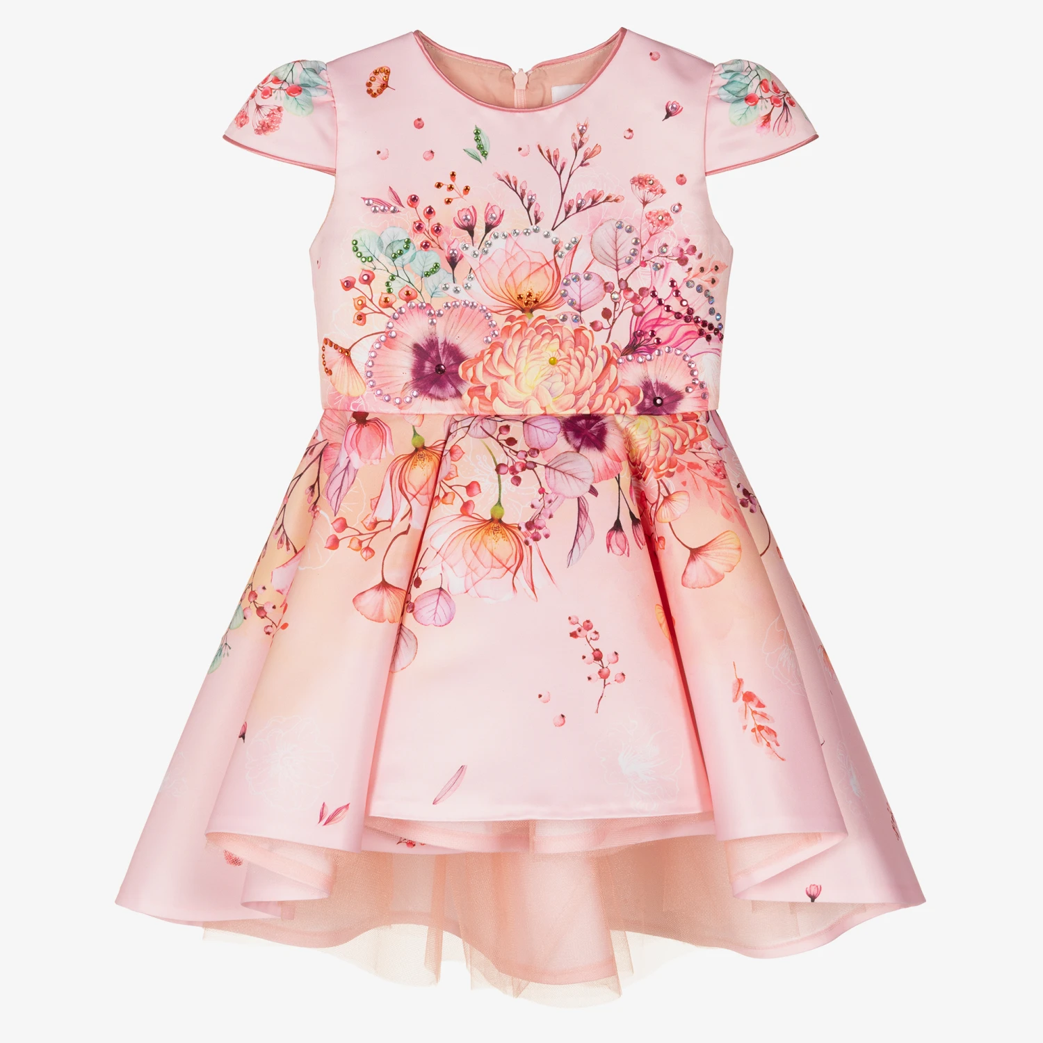 Beautiful pink satin dress by Eirene, with a stunning fishtail back. The silky fabric has a gorgeous floral print, studded with sparkly diamanté for extra sparkle. There are capped short sleeves, a fitted bodice and a pleated, flared skirt which is longer at the back. Tulle underlayers create volume and structure and the dress is fully lined in cotton for comfort, with a back zip to fasten.